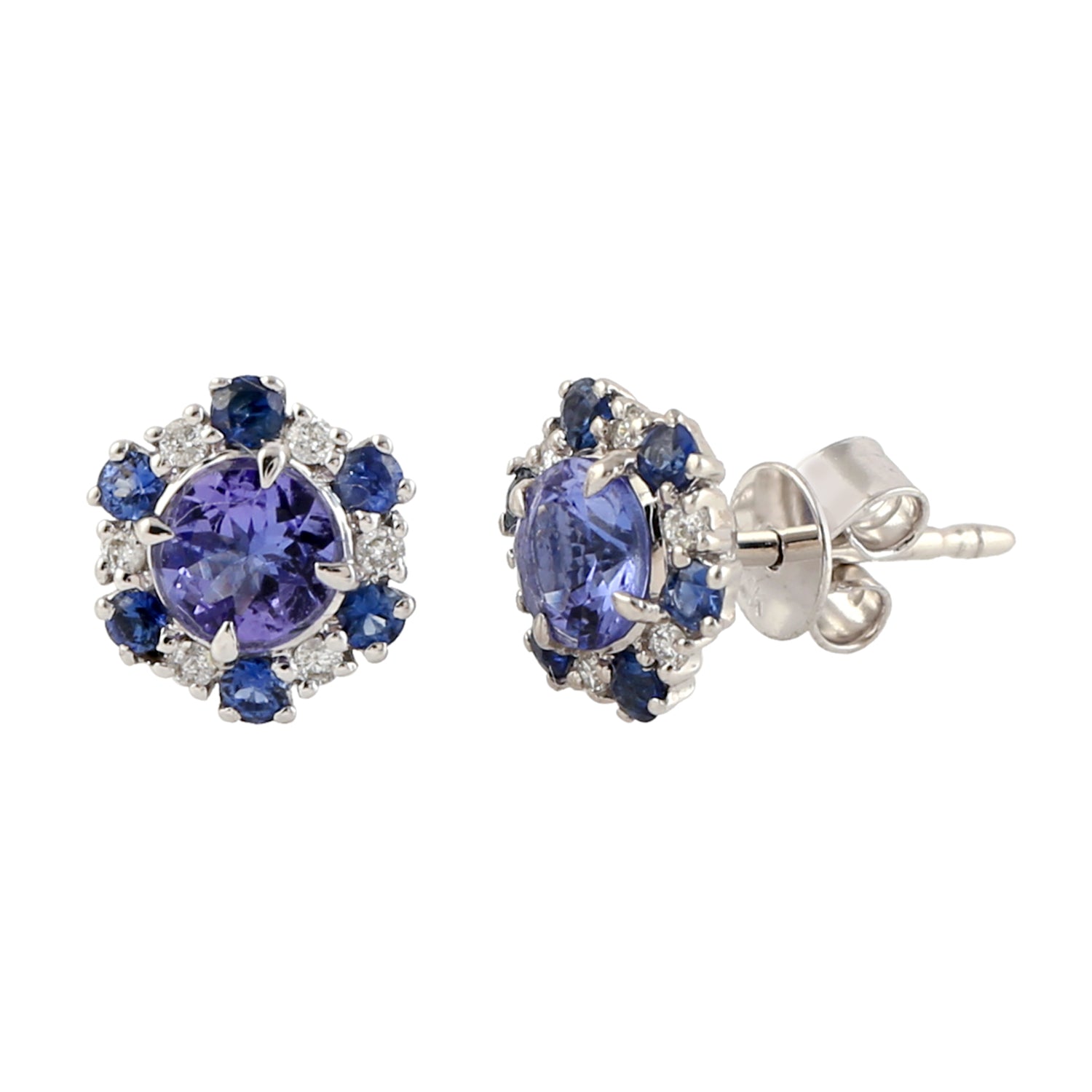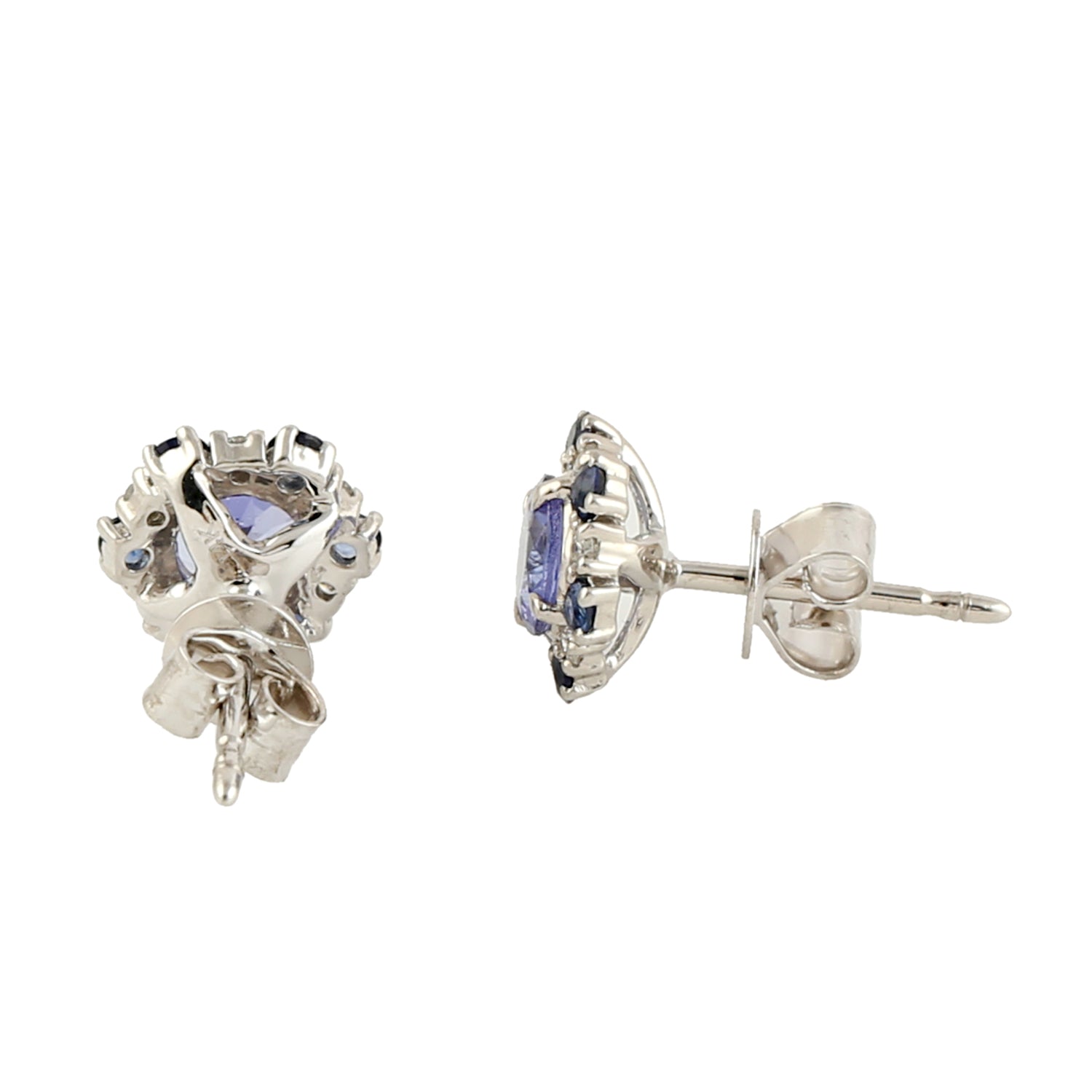 Tanzanite Blue Sapphire Prong Diamond Beautiful Stud Earrings in 14k White Gold