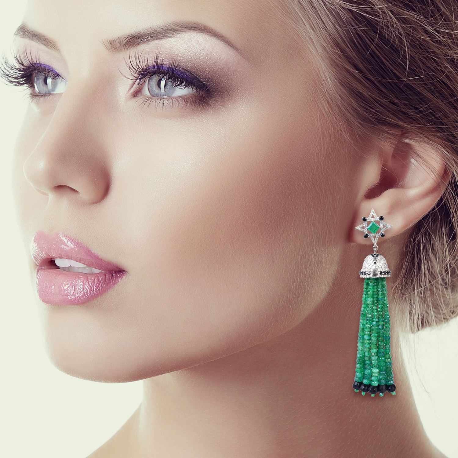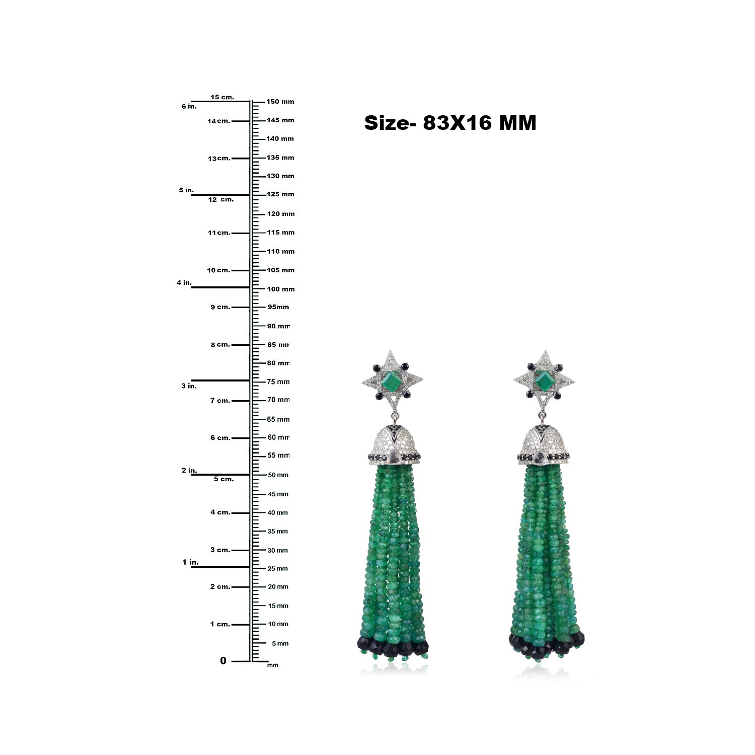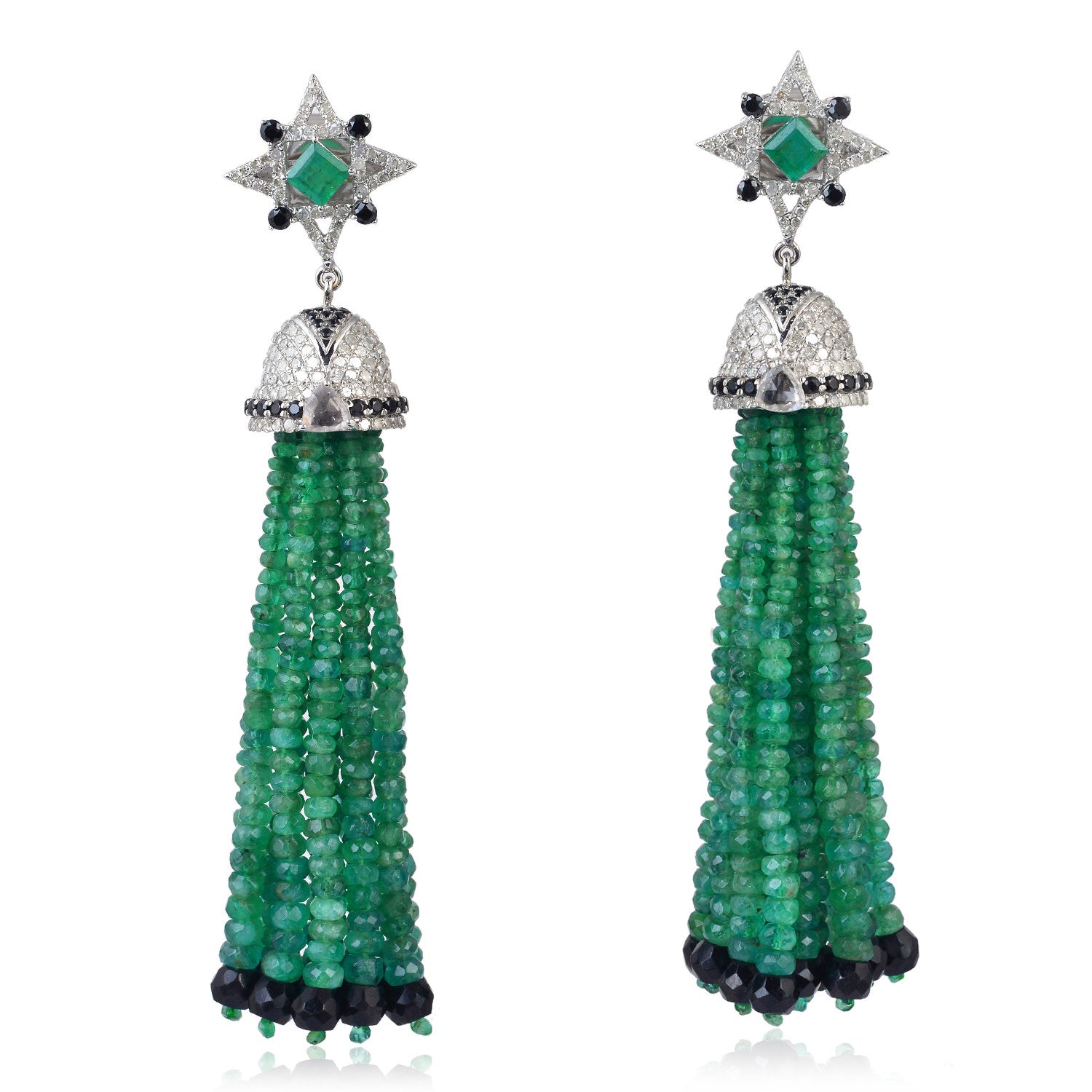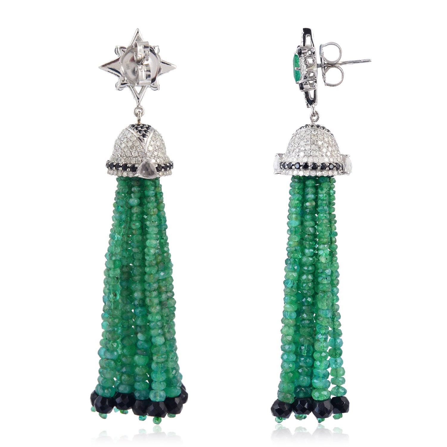 Emerald Beaded Tassel Earrings with Diamonds & Black Spinel Sapphire in 18K White Gold Silver
