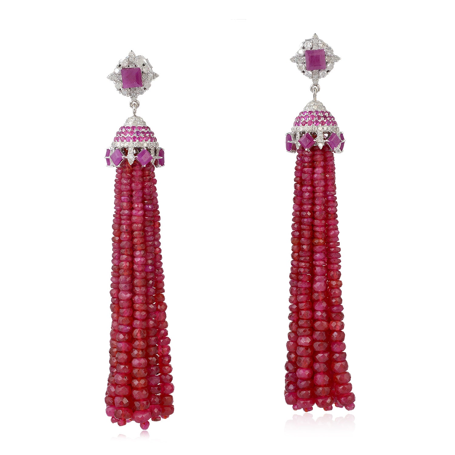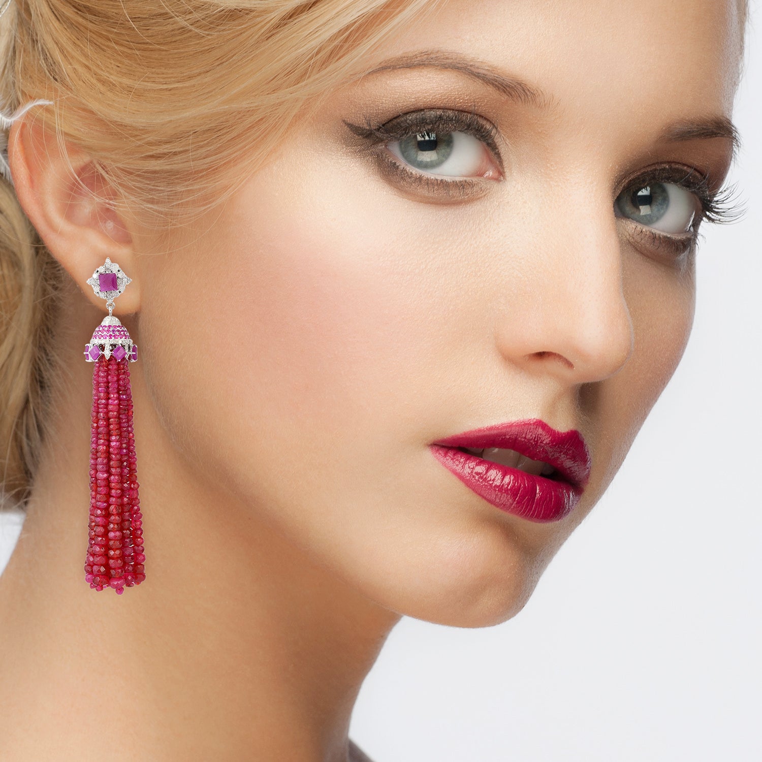Ruby Beaded Tassel Earrings with Diamond Accents In 18K White Gold Silver Statement Jewelry