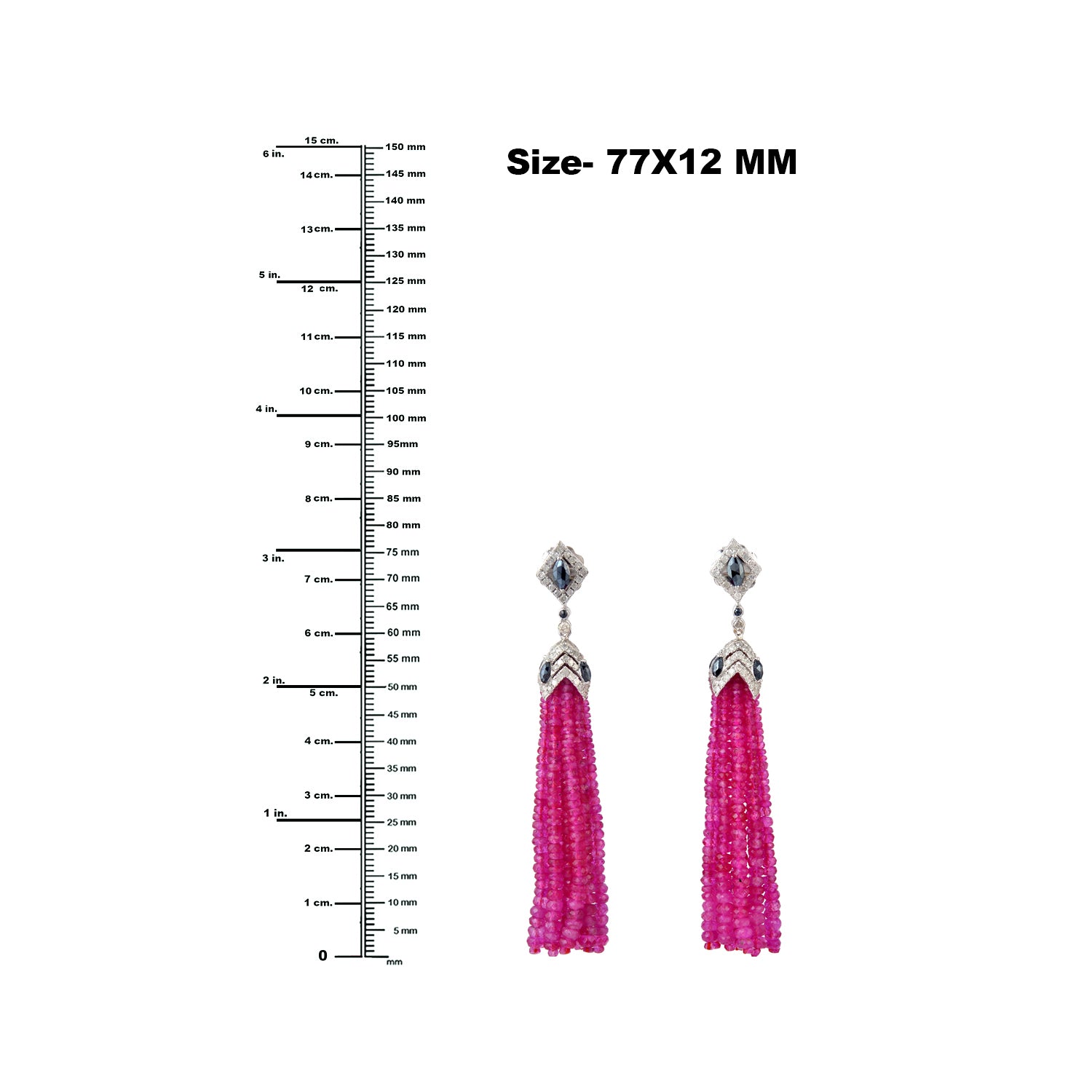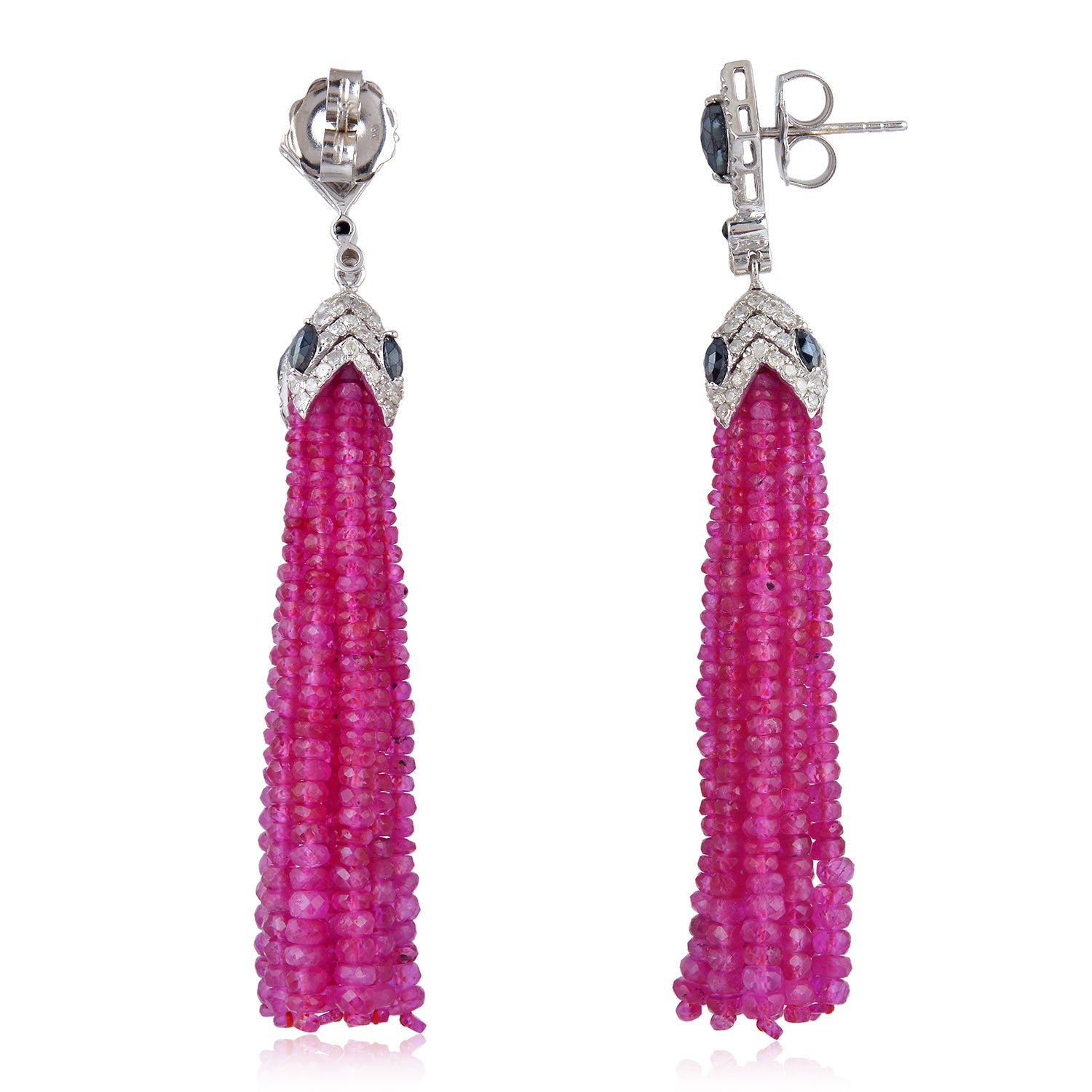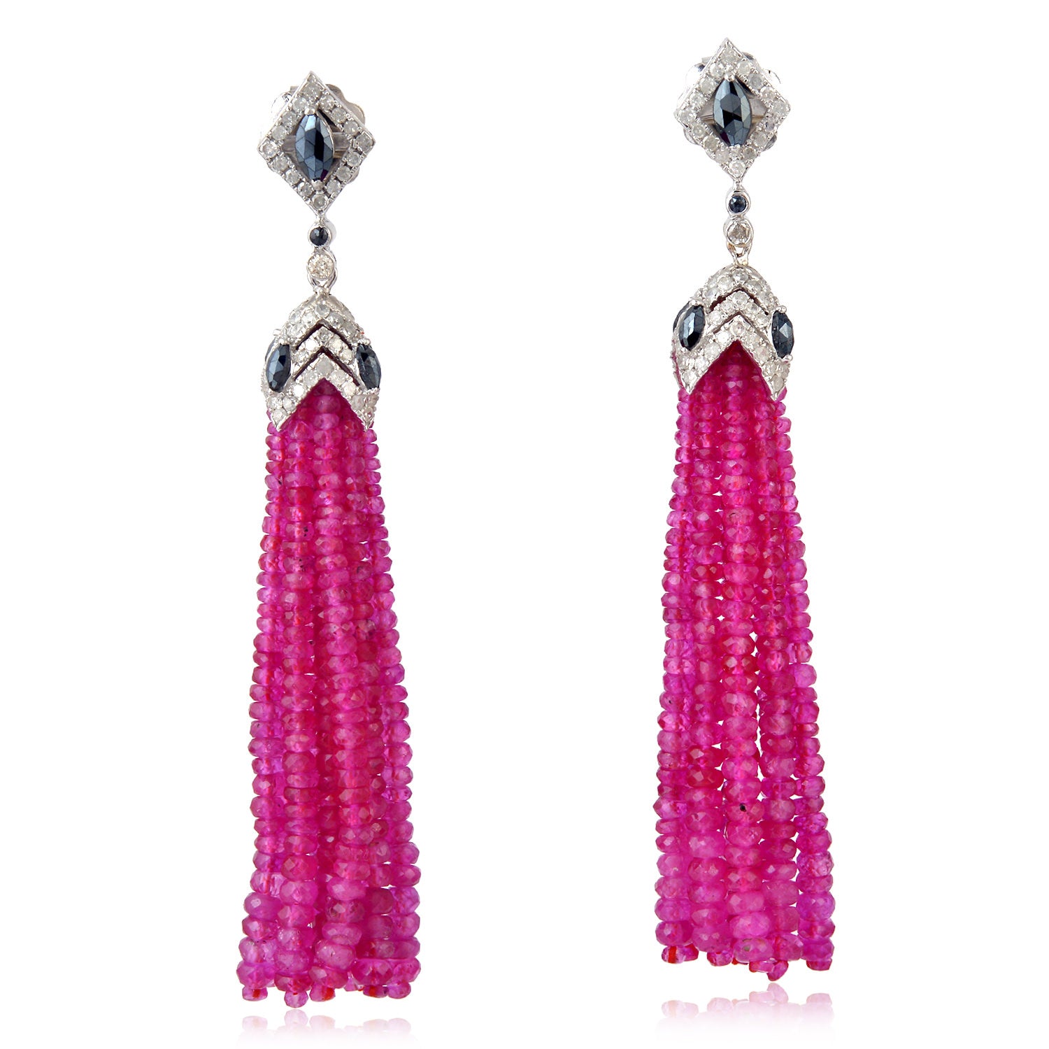 Ruby Beaded Tassel Earrings with Diamonds and Black Spinel in 18K White Gold Silver