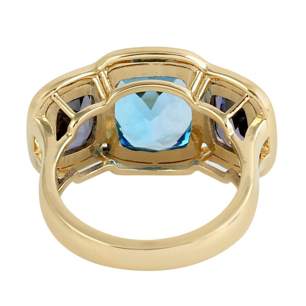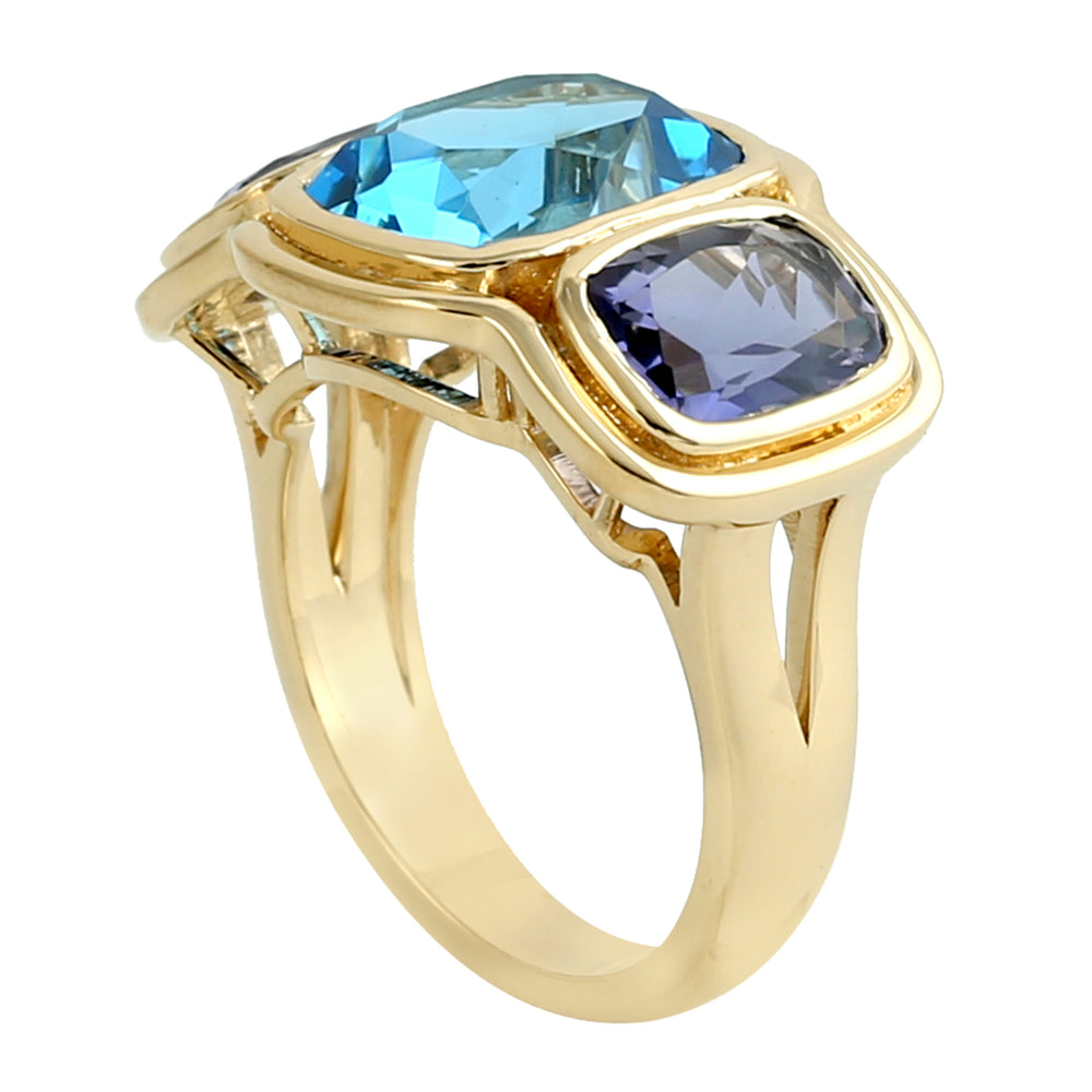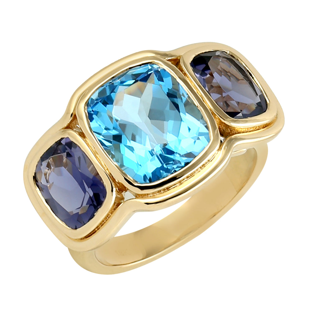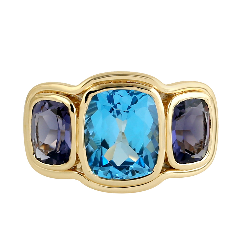 Bezel Set Blue Topaz Cushion Cut Iolite Three Stone Ring in 18k Yellow Gold