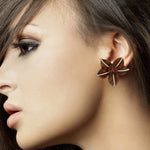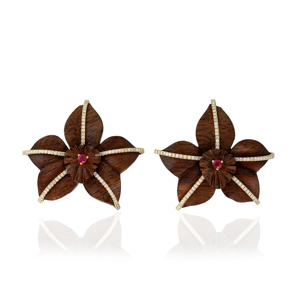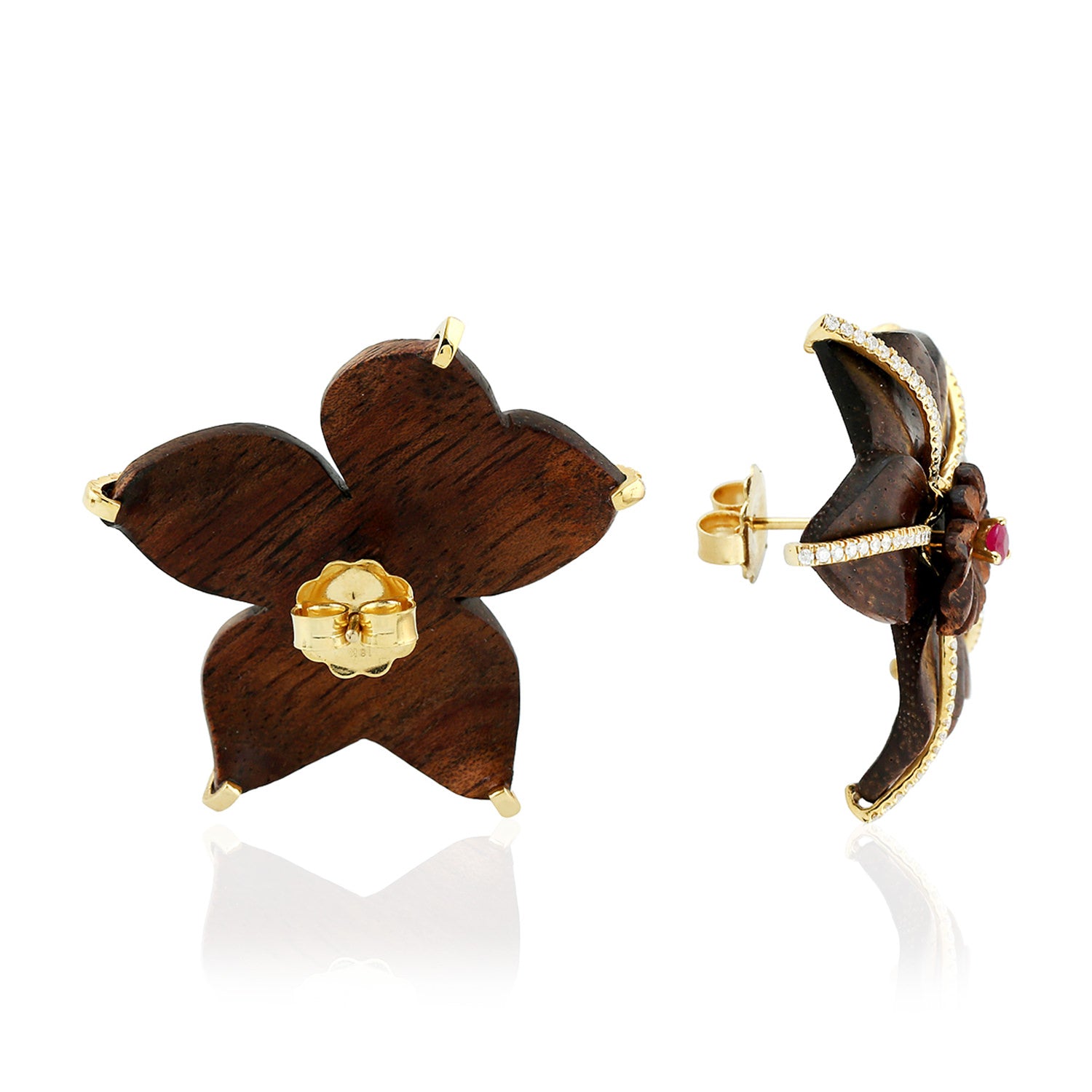 Ruby Gemstone Pave Diamond Carved Wood Stud Earrings In 18k Yellow Gold