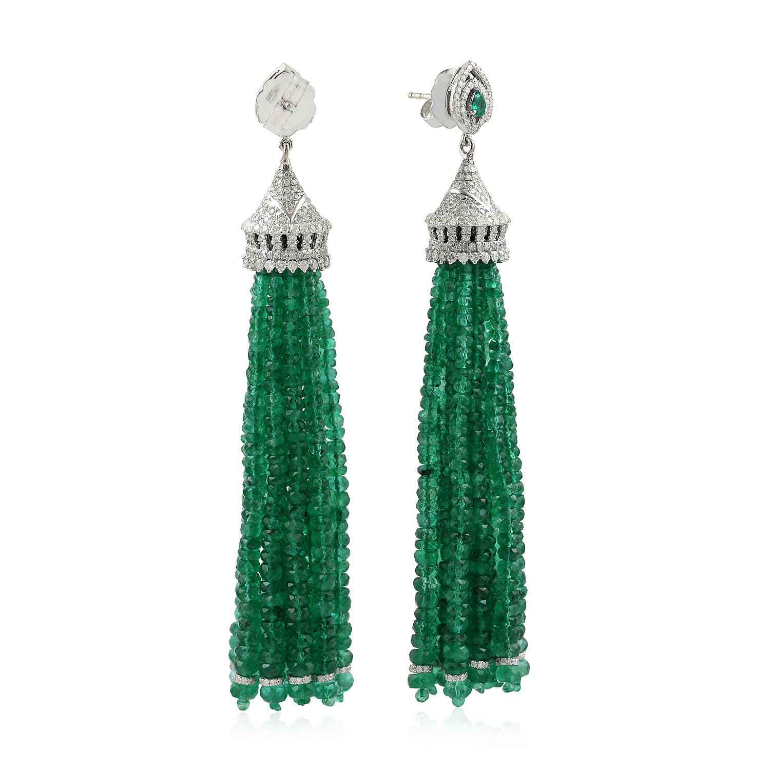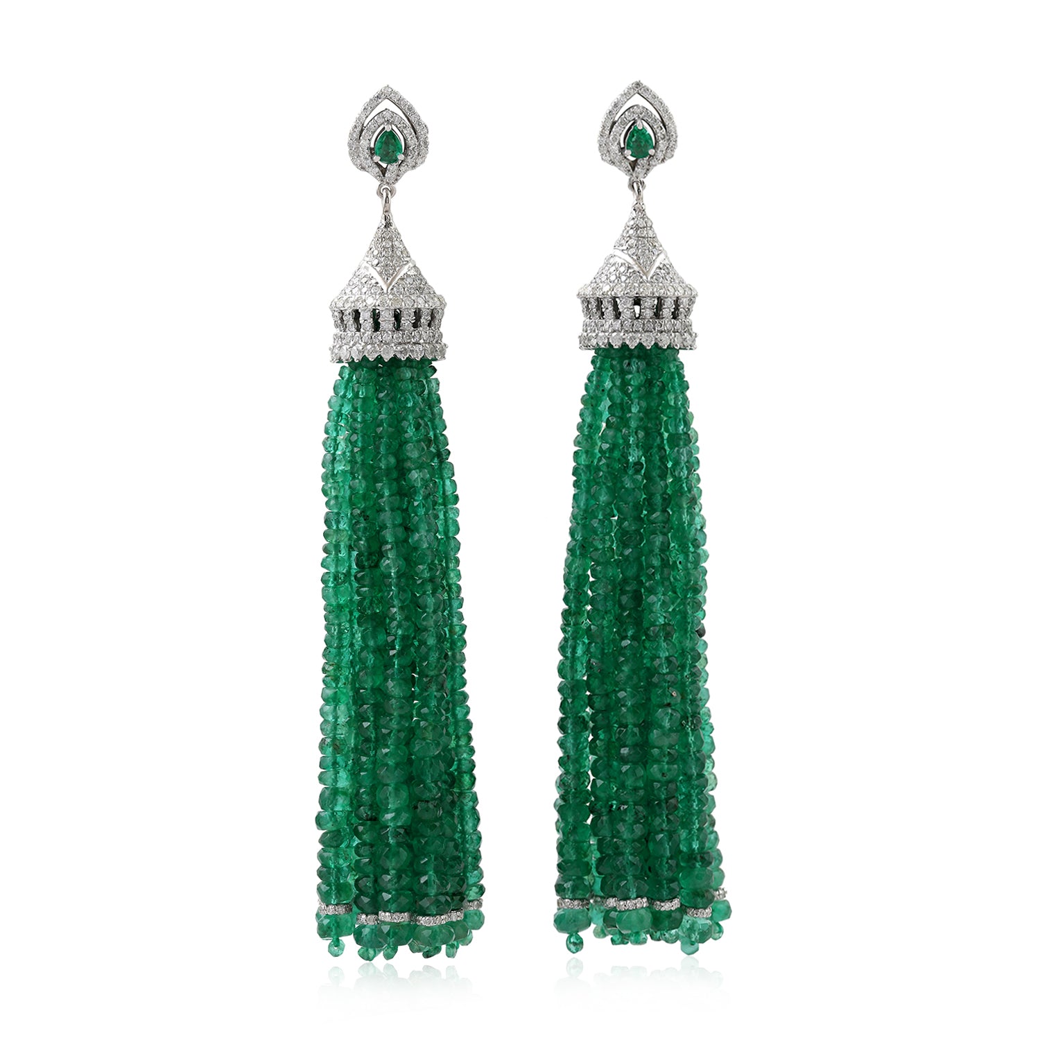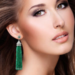 Faceted Emerald Beads Pave Diamond Tassel Earrings in 18K White Gold – Statement Jewelry for Her
