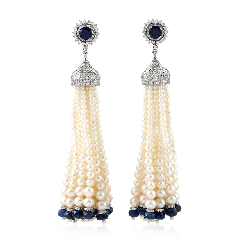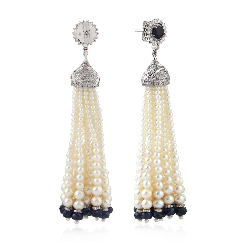 Blue Sapphire Beads & Pearl Gemstone Pave Diamond Tassel Earrings in White Gold
