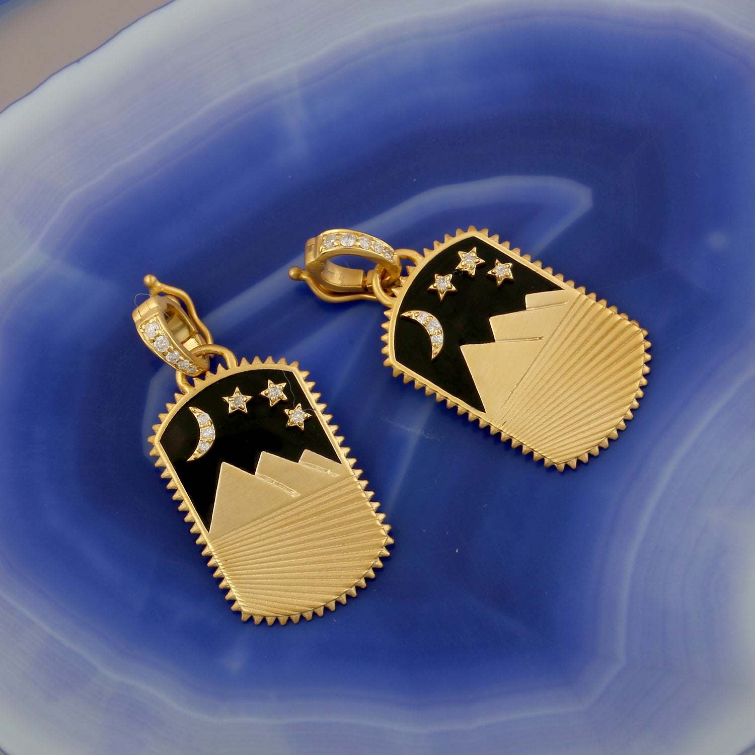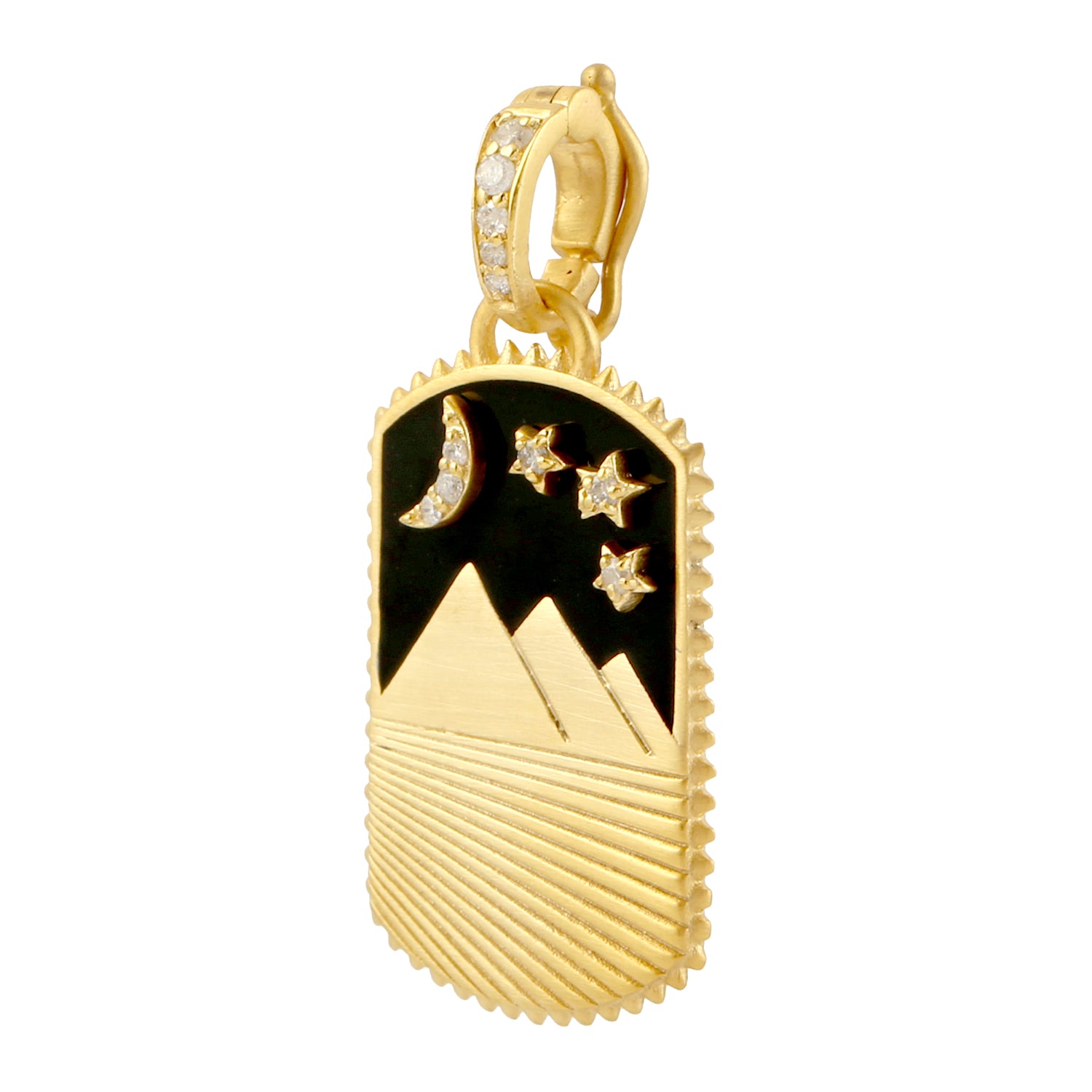 14K Yellow Gold Crescent Moon Desert Star Enamel Pendant Prong Set Diamond