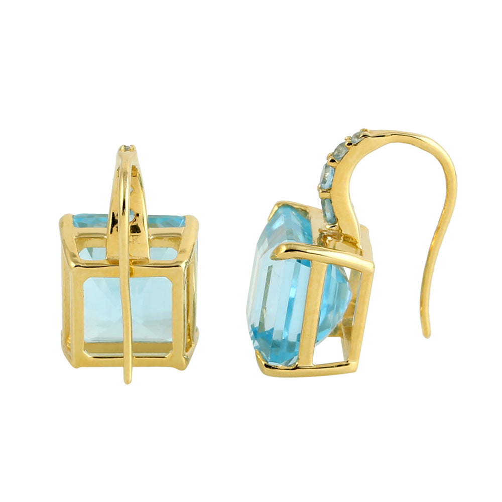 • 14k Yellow Gold Square Cut Blue Topaz Gemstone Ear Hook Earrings