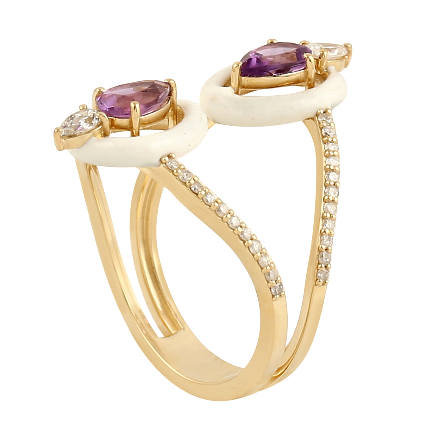 14k Yellow Gold Micro Pave Diamond Pear Cut Amethyst Enamel Designer Ring
