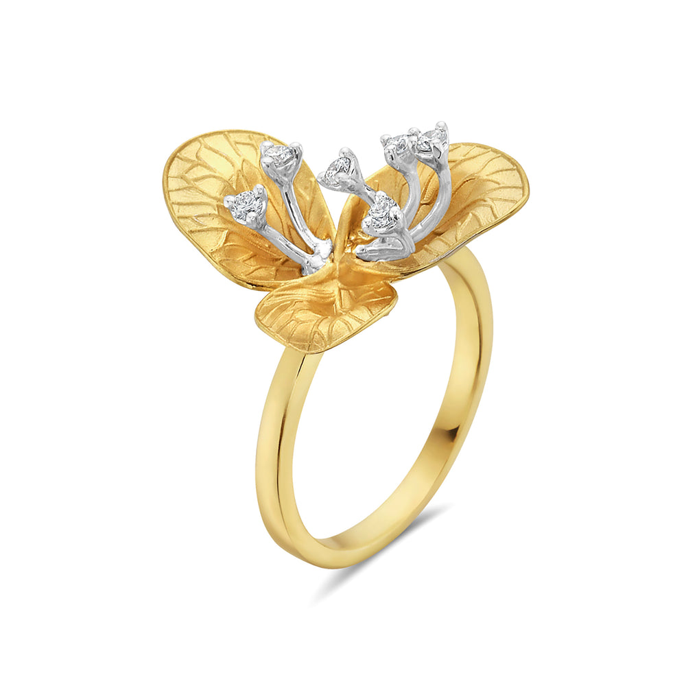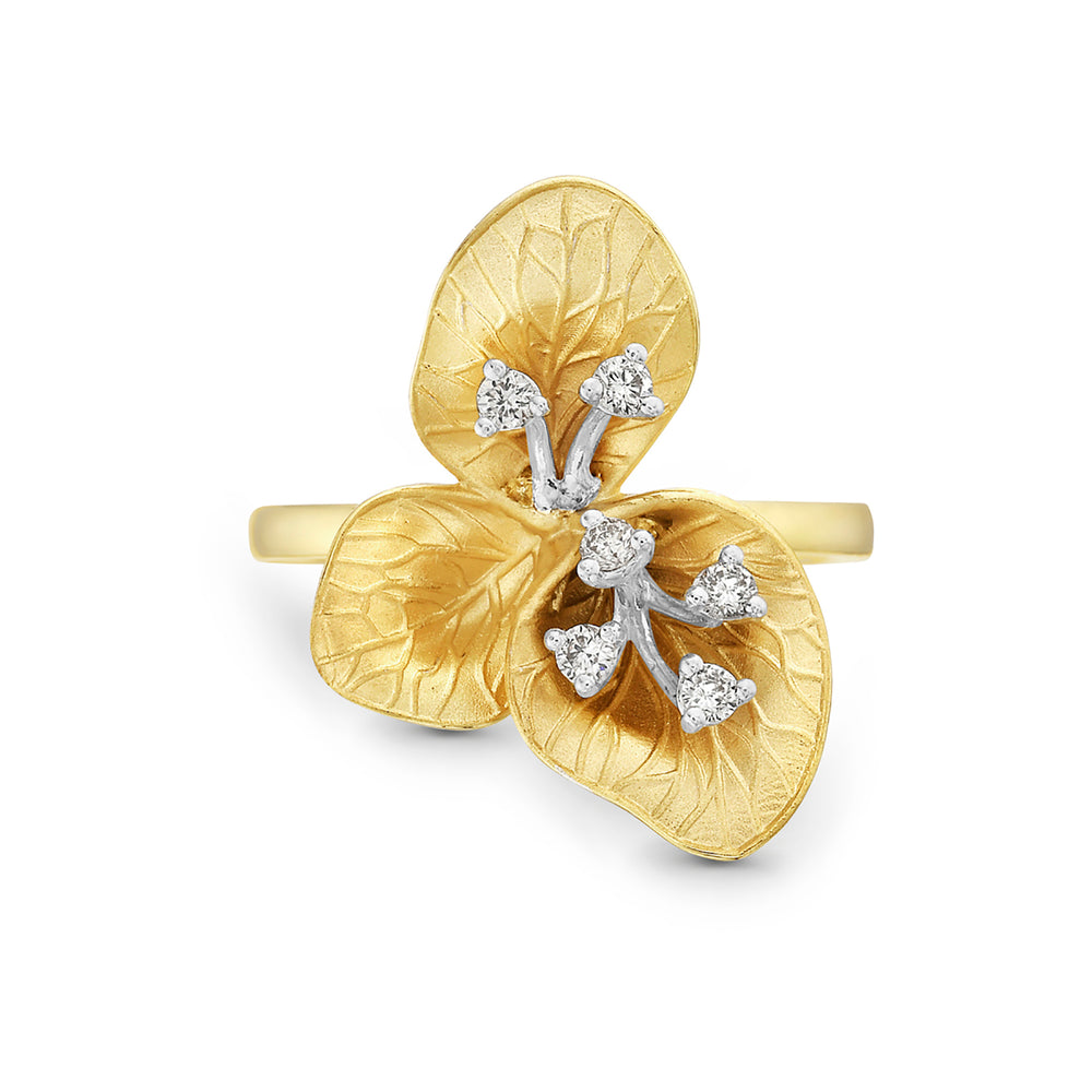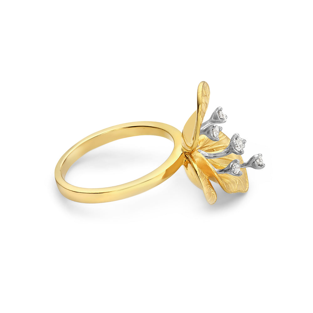14K Yellow Gold Peony Design Flower Ring Prong Set Diamond