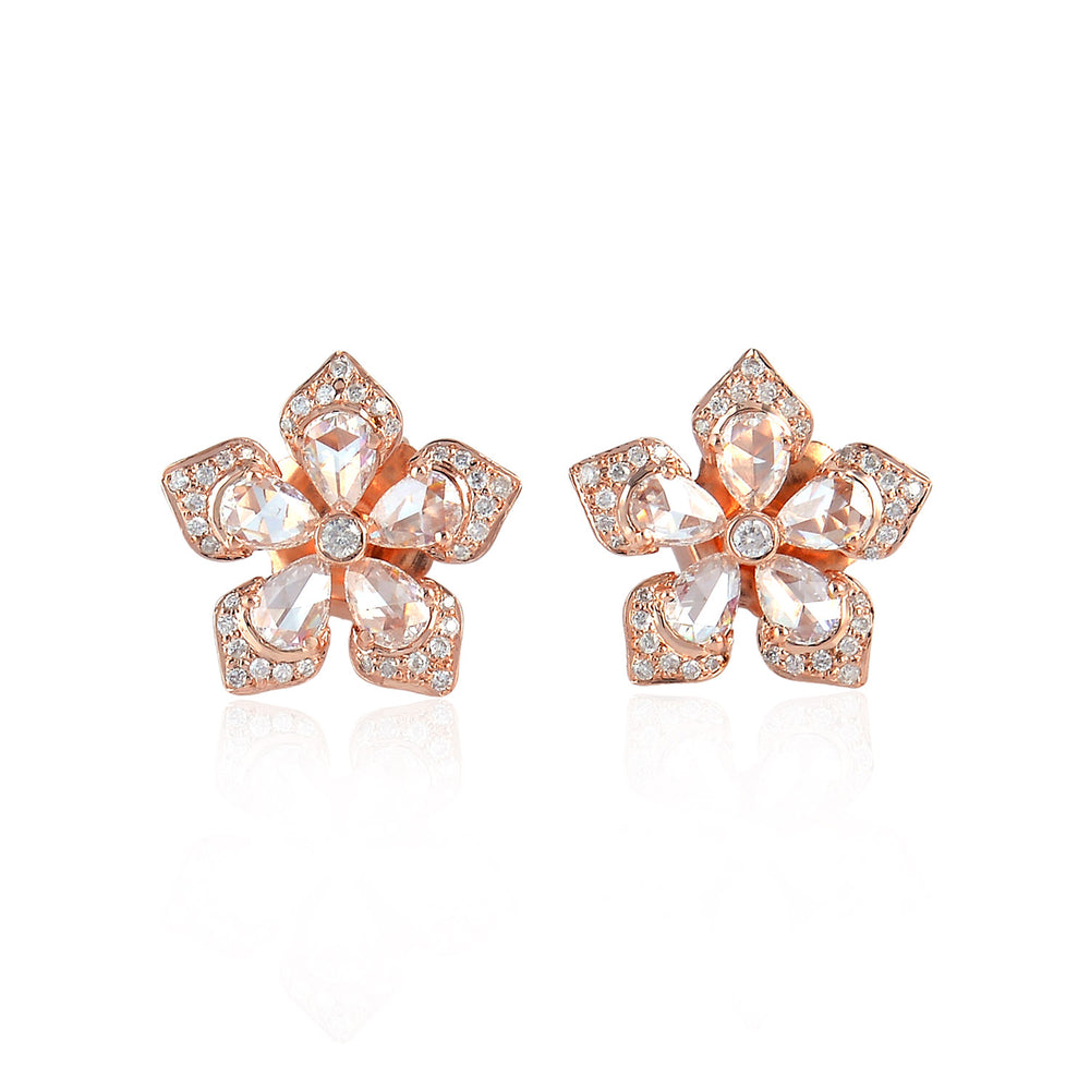 Rose-Cut Diamond Blossom Stud Earrings in 18K Rose Gold – Elegant Holiday Sparkle