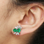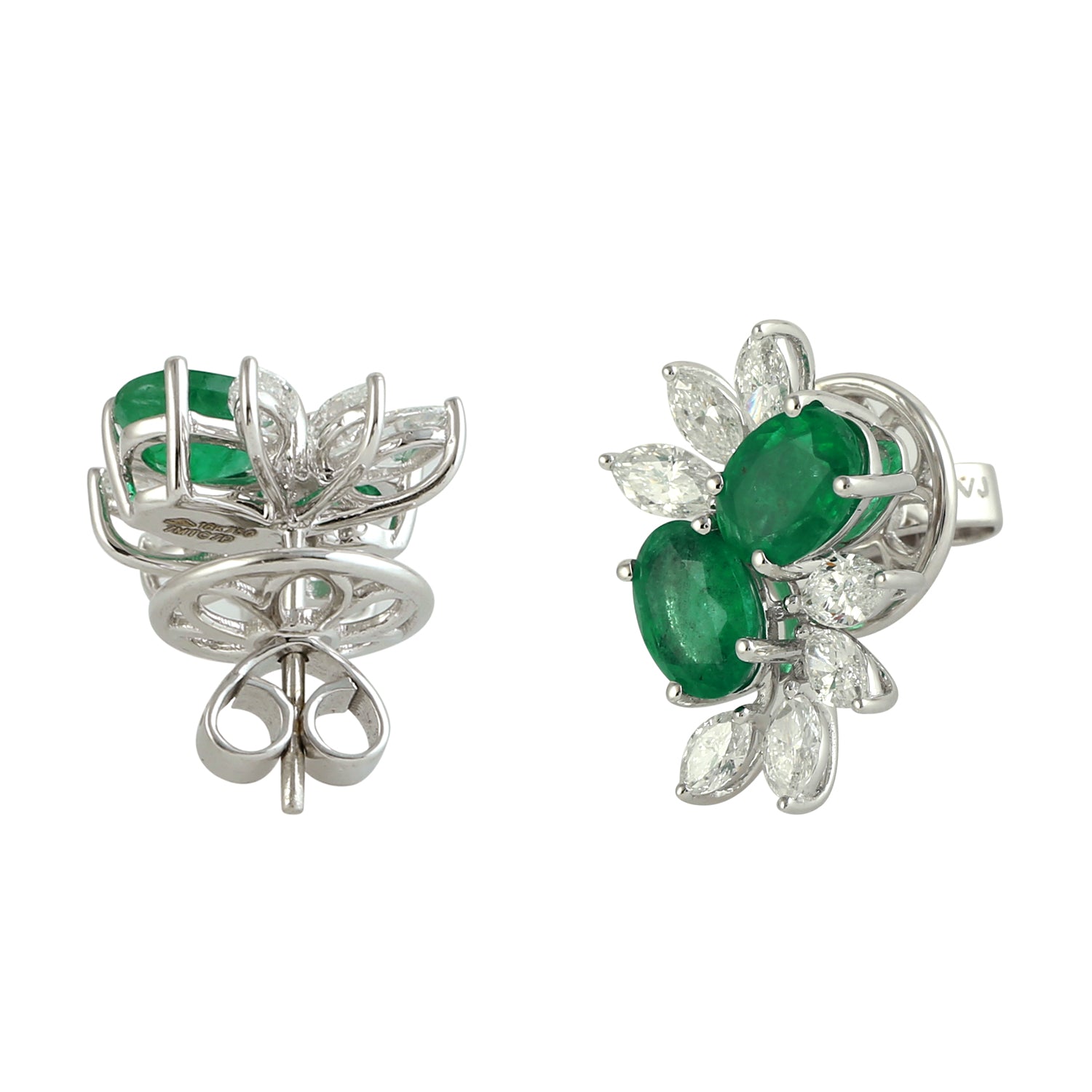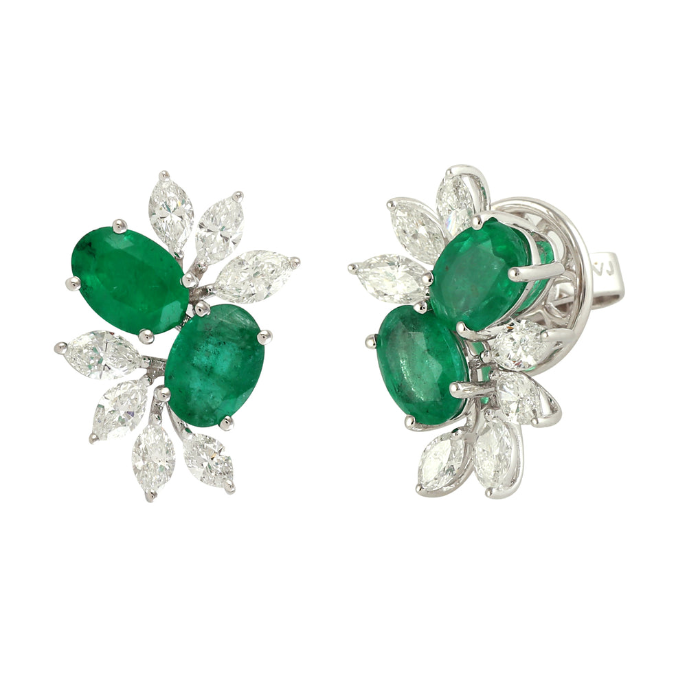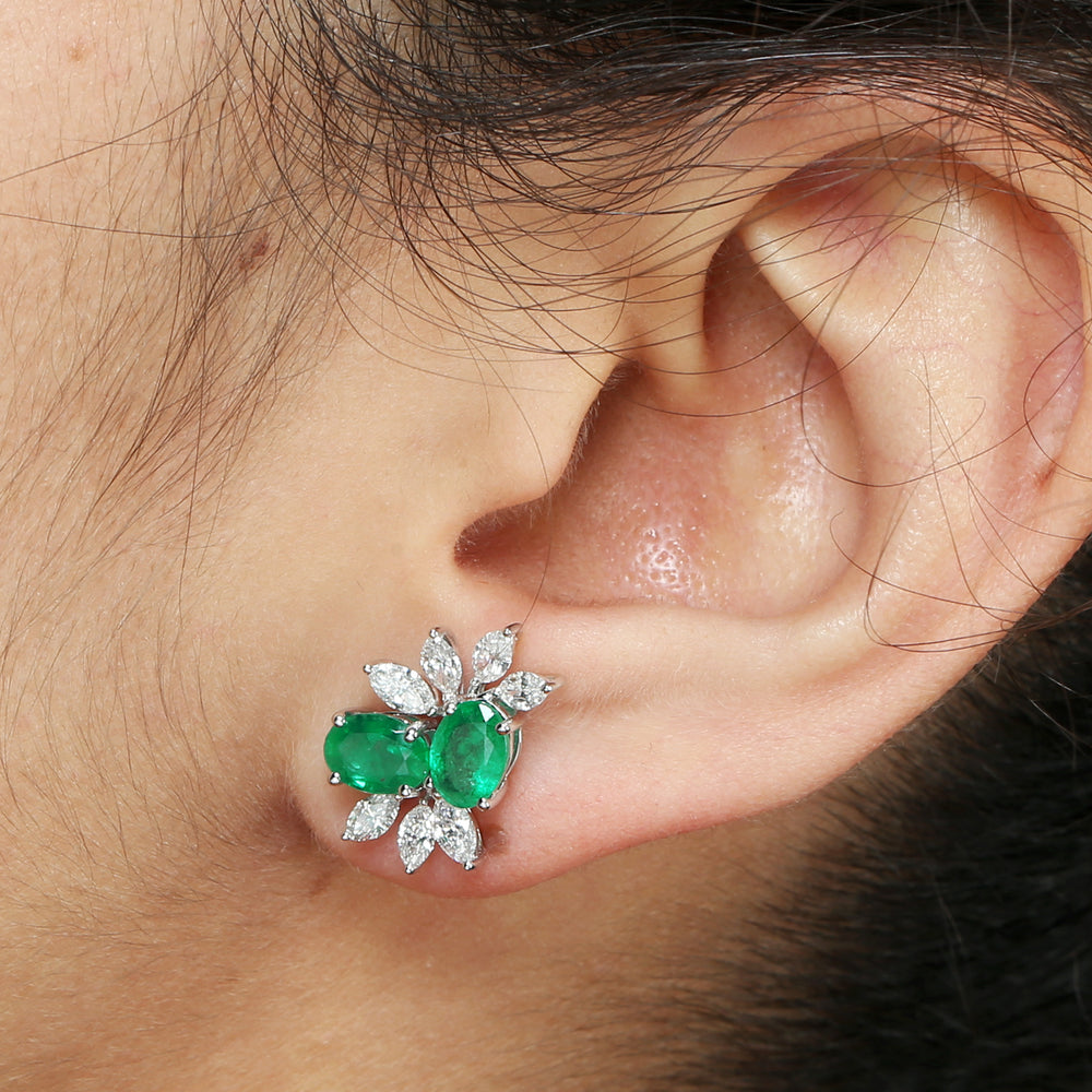 18K White Gold Prong Rose Diamond Oval Emerald Stud Earrings For Birthday Gifts