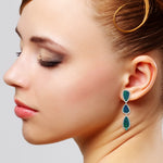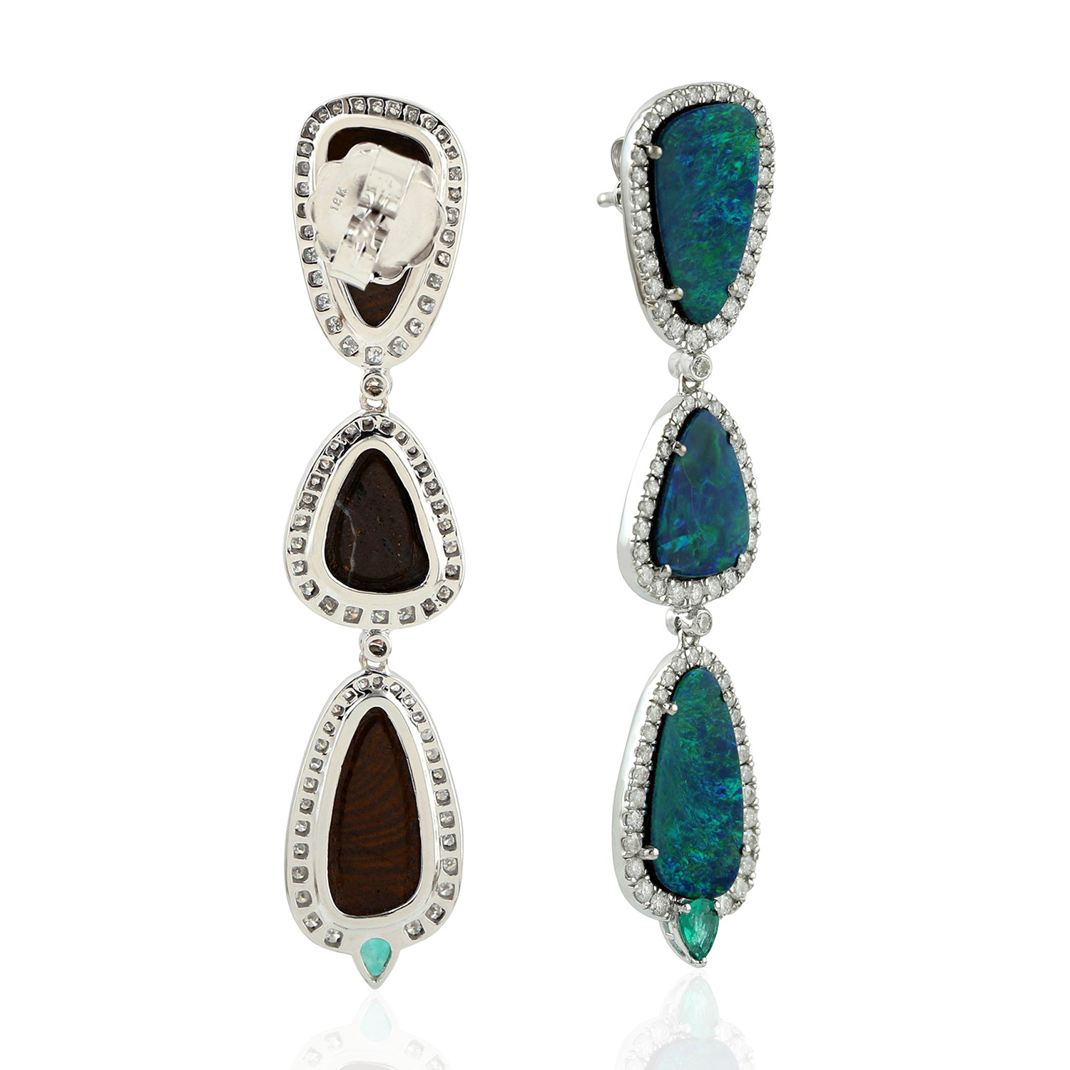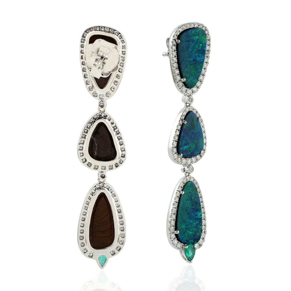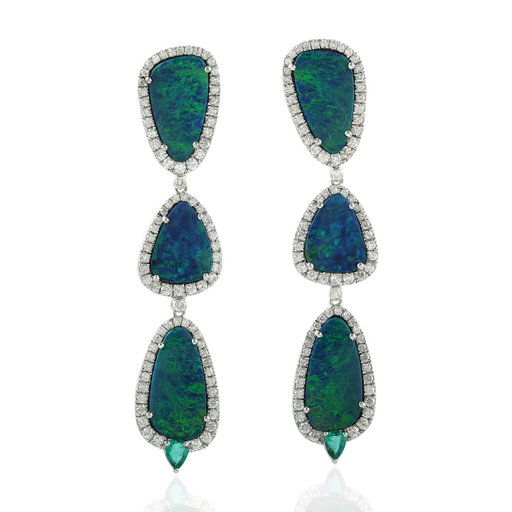 18K White Gold Oval Opal Doublet Pear Emerald Prong Diamond Dangler For Wedding
