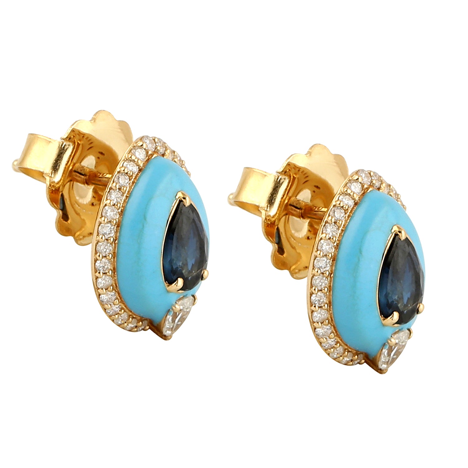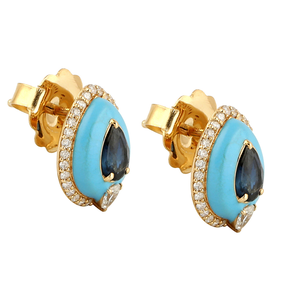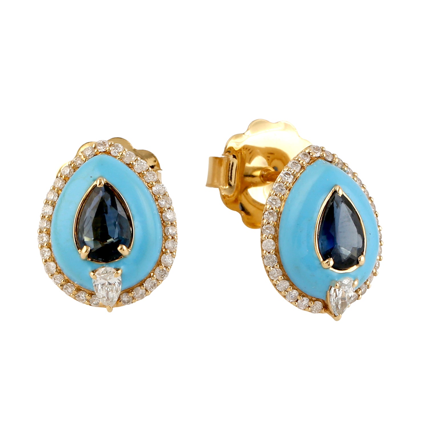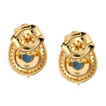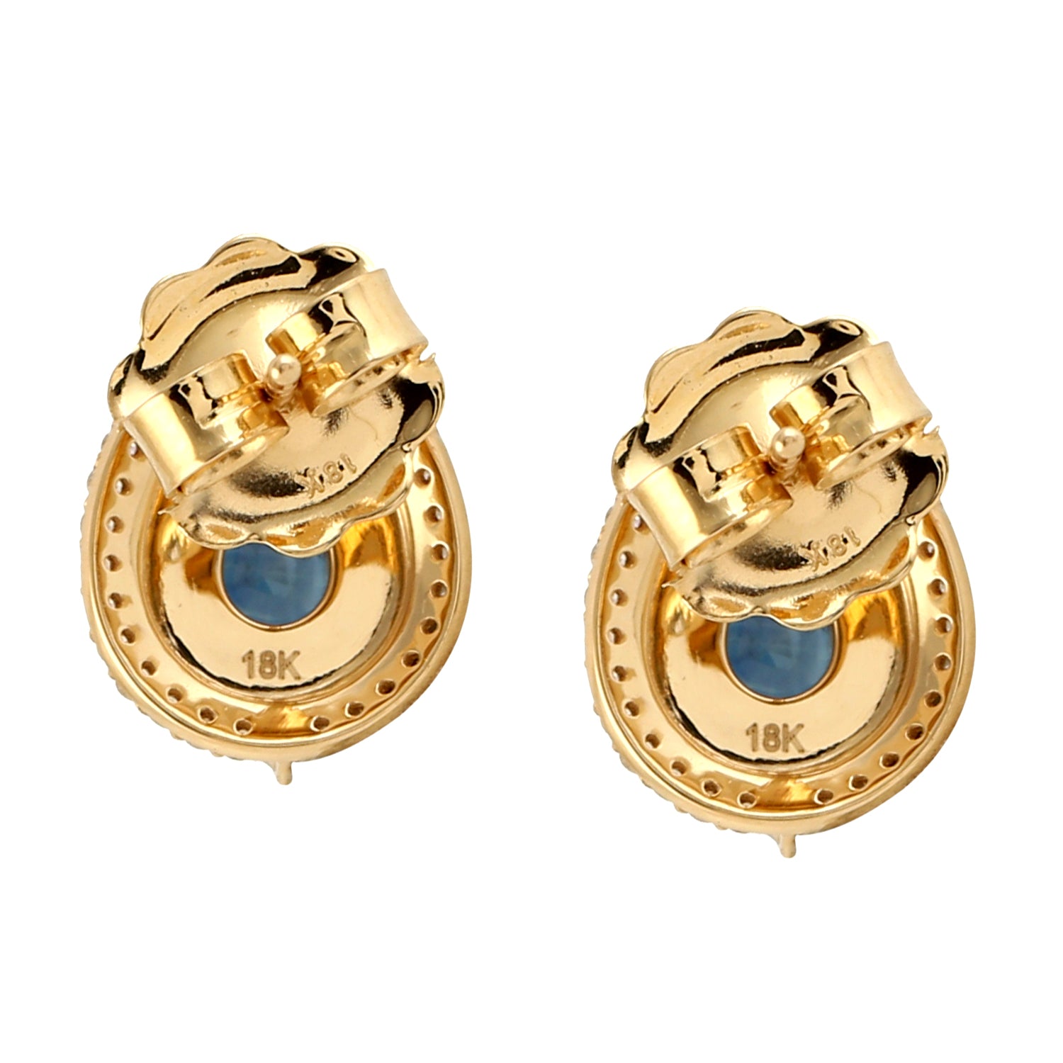 18k Yellow Gold Blue Sapphire Gemstone Pave Diamond Evil Eye Stud Earrings