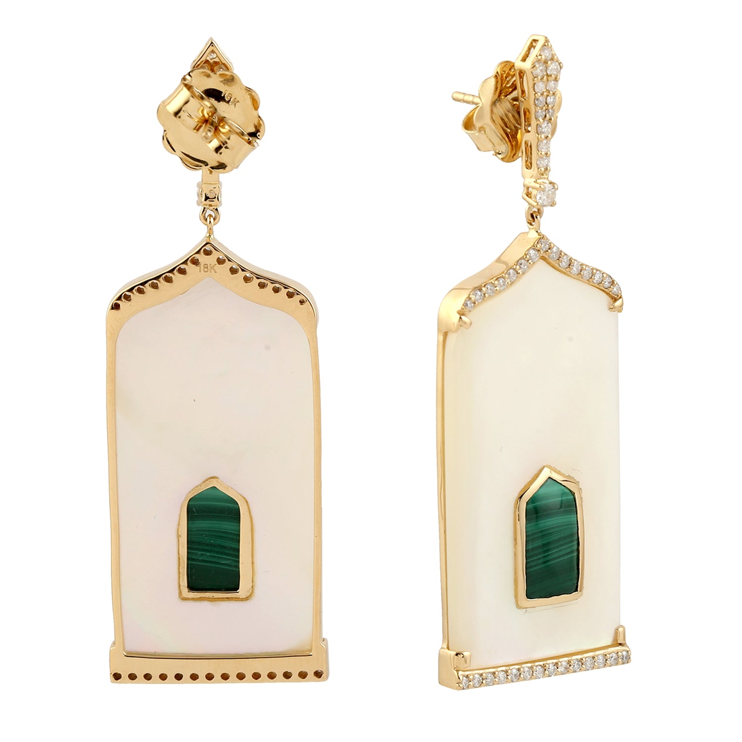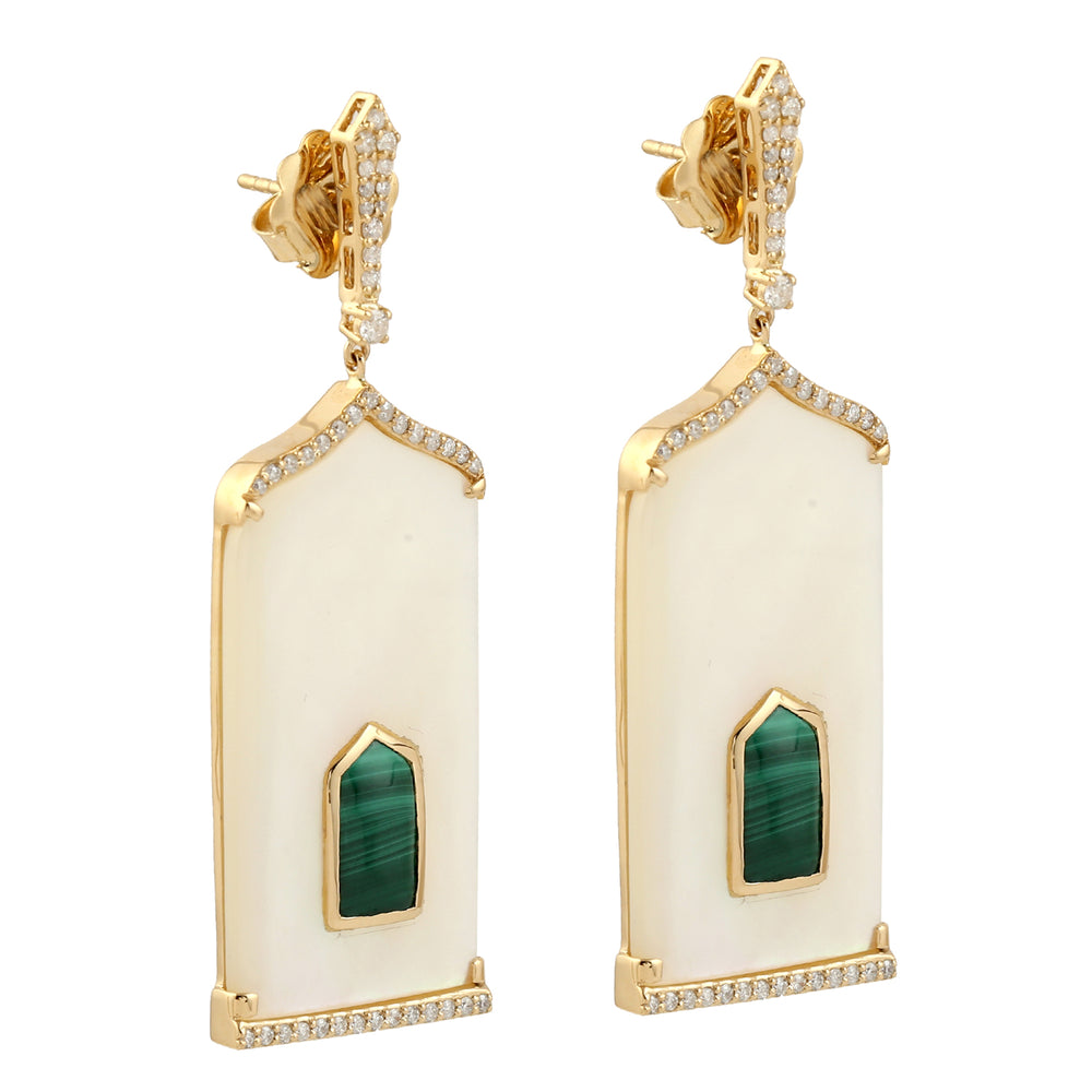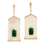 18k Yellow Gold MOP Bezel Malachite Gemstone Pave Diamond Dangle Earrings