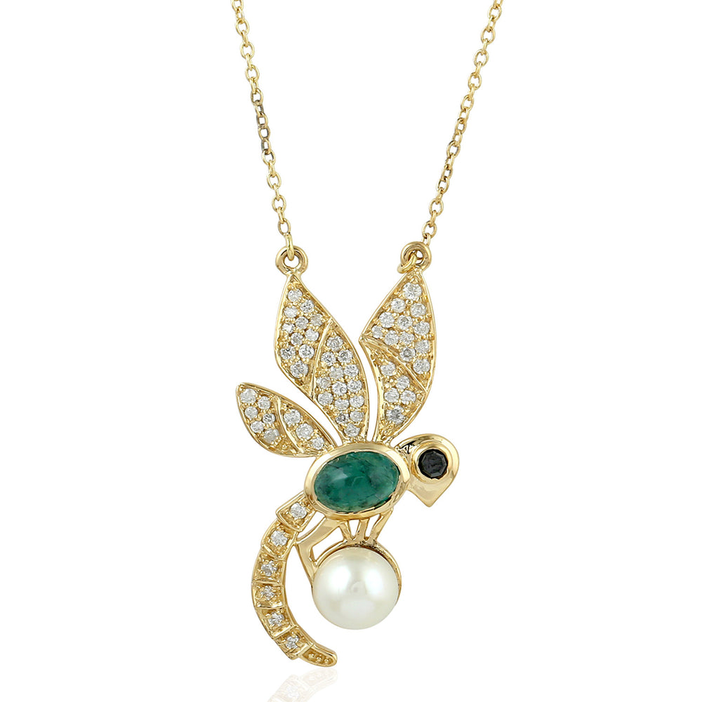 Oval Cut Emerald, Pearl & Pave Diamond Dragonfly Necklace in 18K Yellow Gold