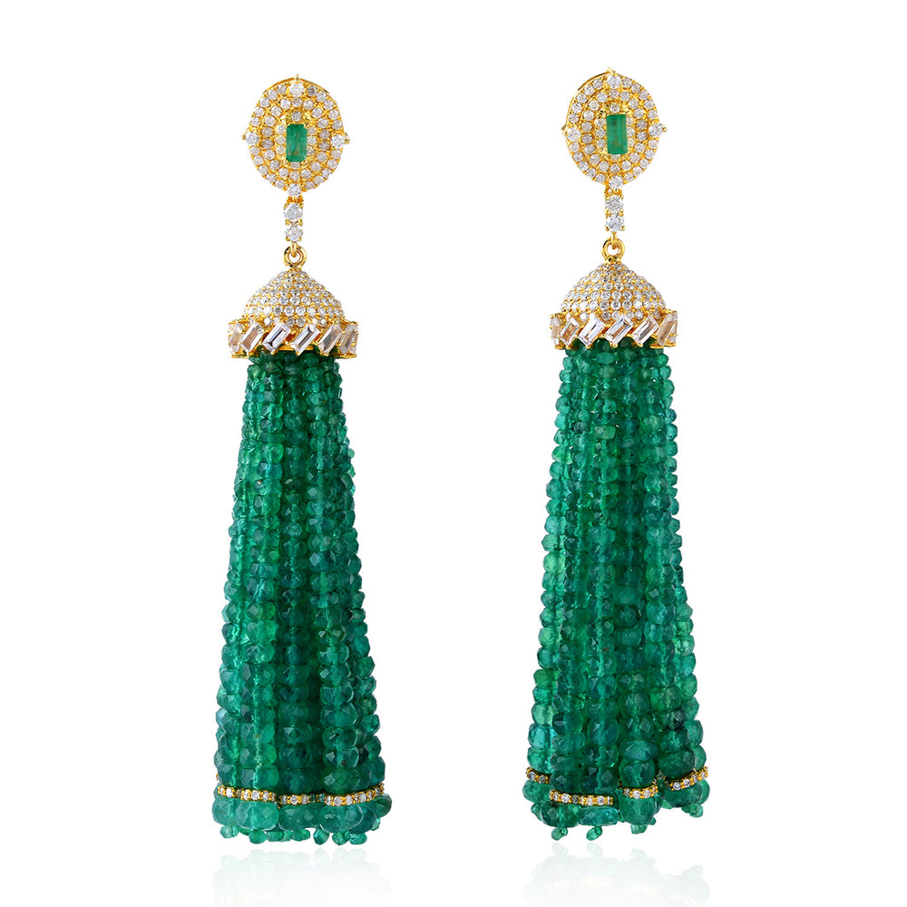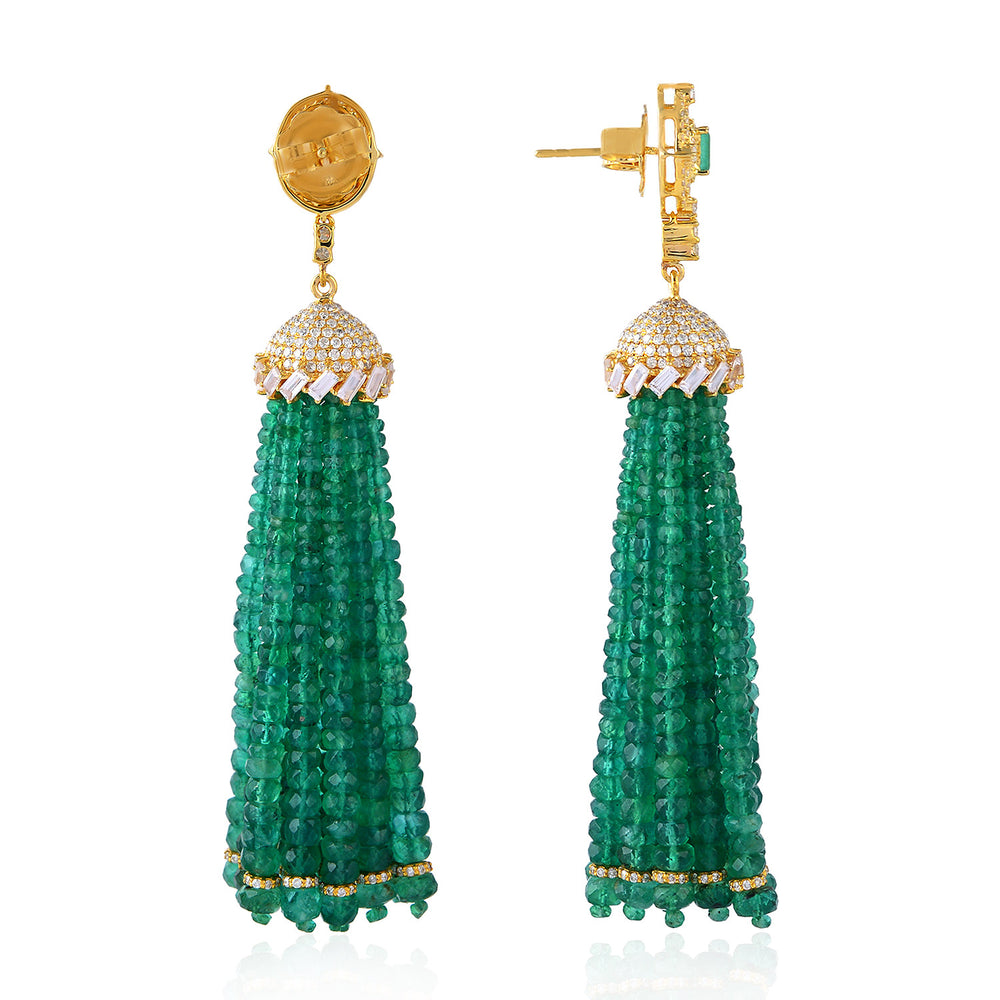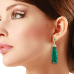 Faceted Emerald Beads & White Sapphire Tassel Earrings with Pave Diamonds in Gold
