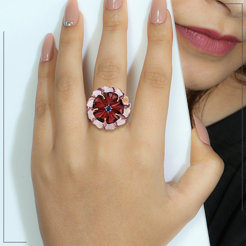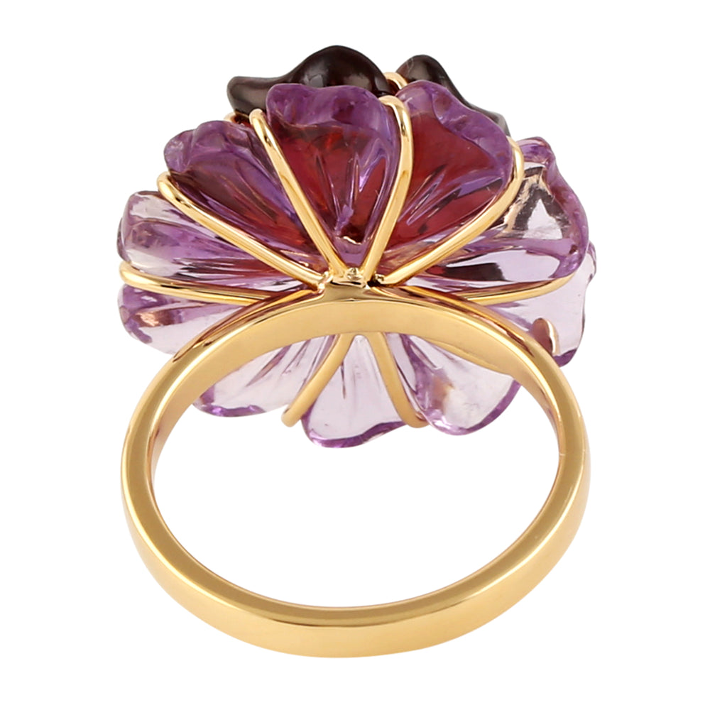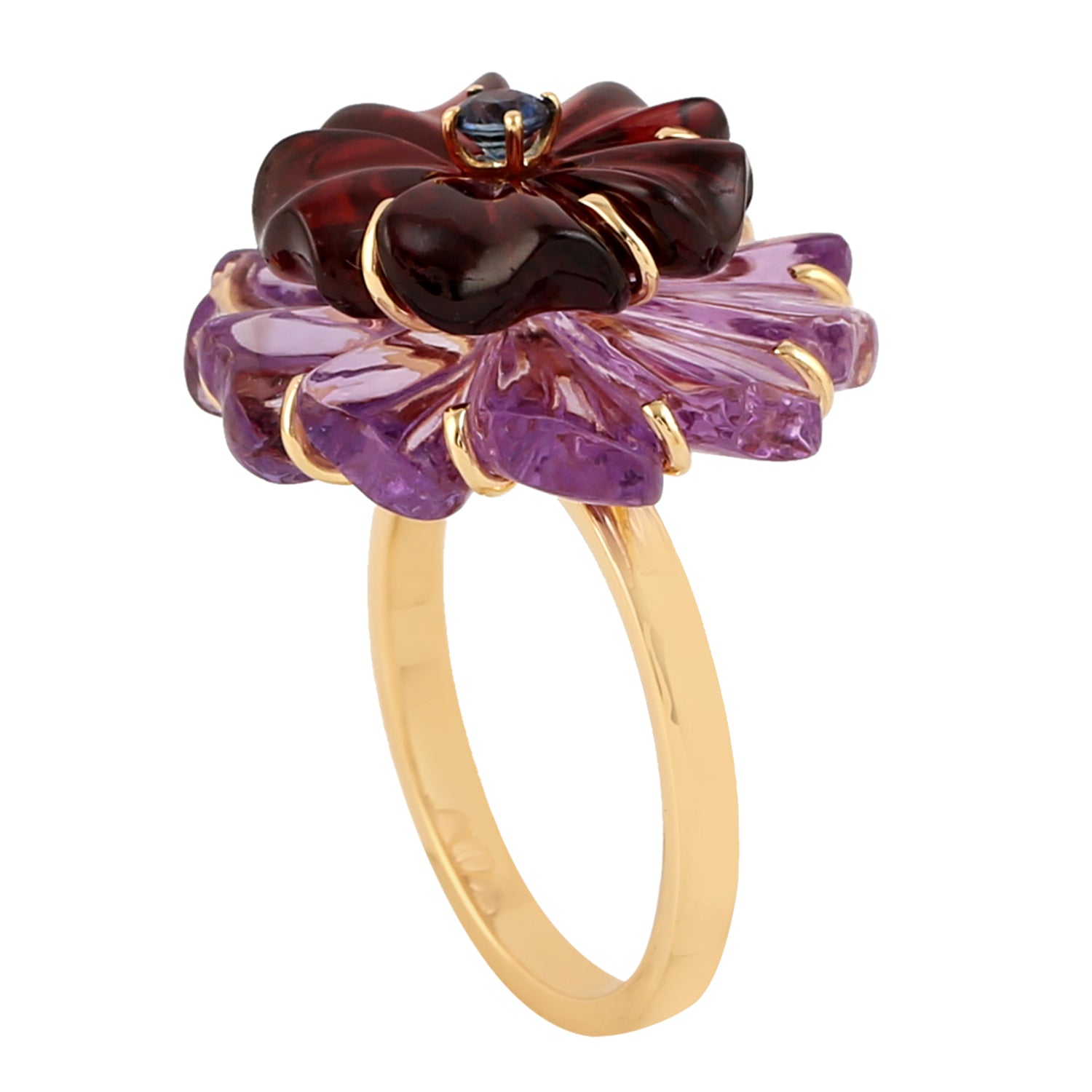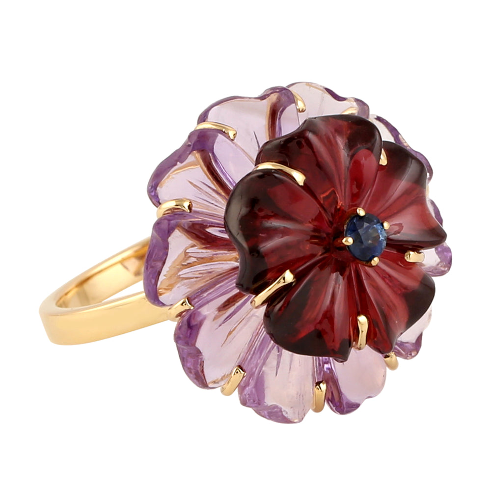 Blue Sapphire & Carved Mixed Gemstone Flower Ring in 18K Yellow Gold – Prong Set Designer Jewelry