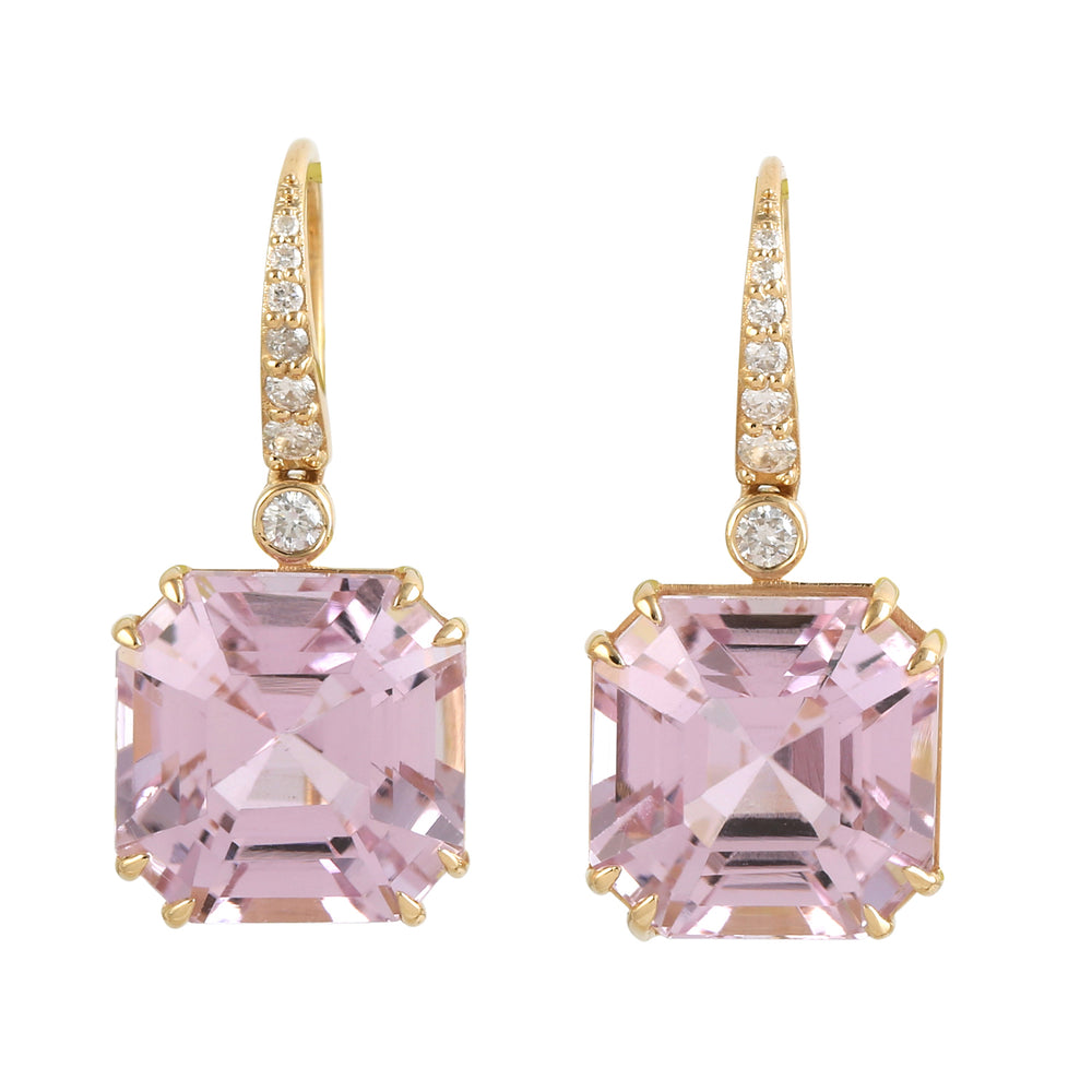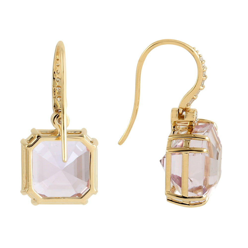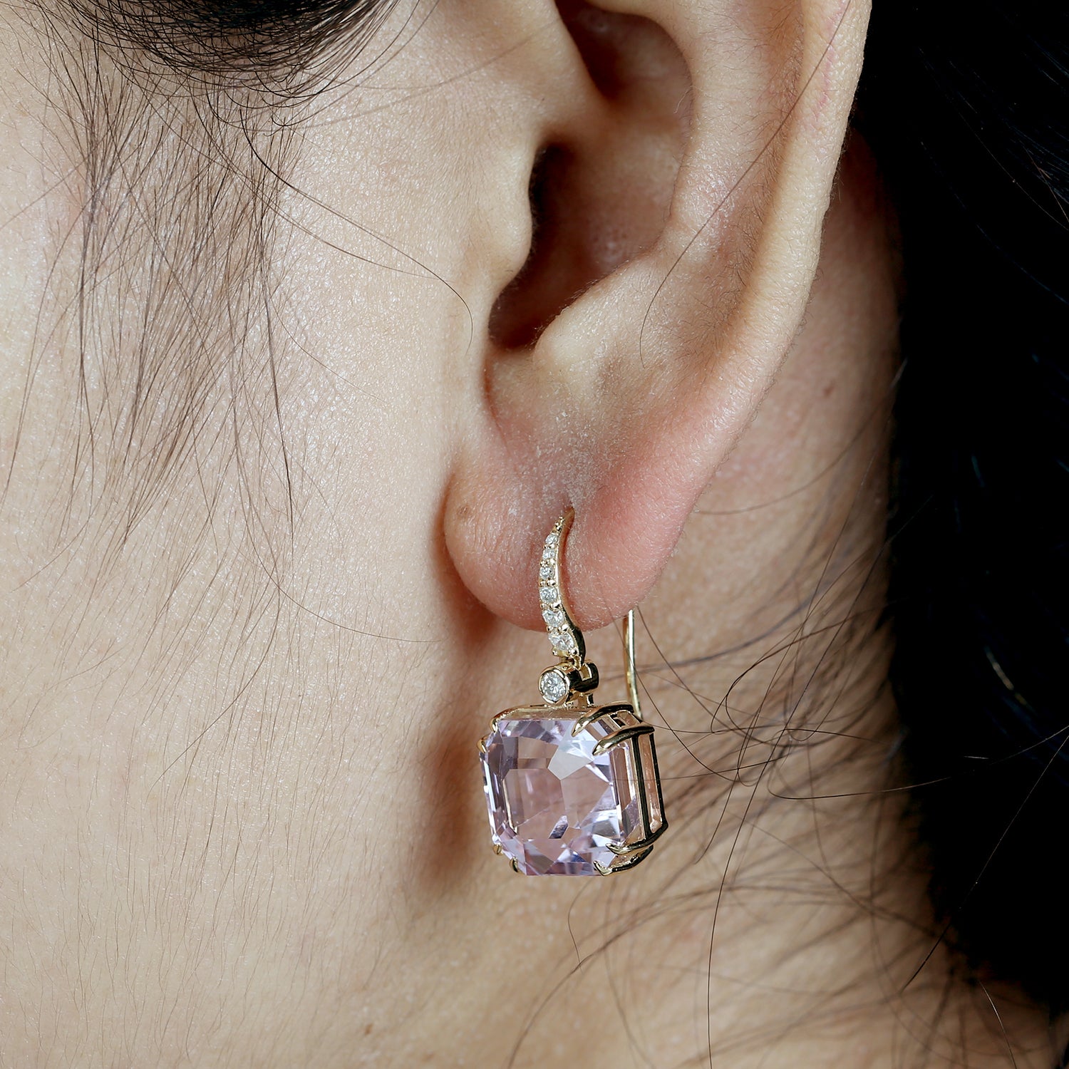 18k Yellow Gold Square Cut Kunzite Gemstone Pave Diamond Ear Hook Earrings
