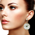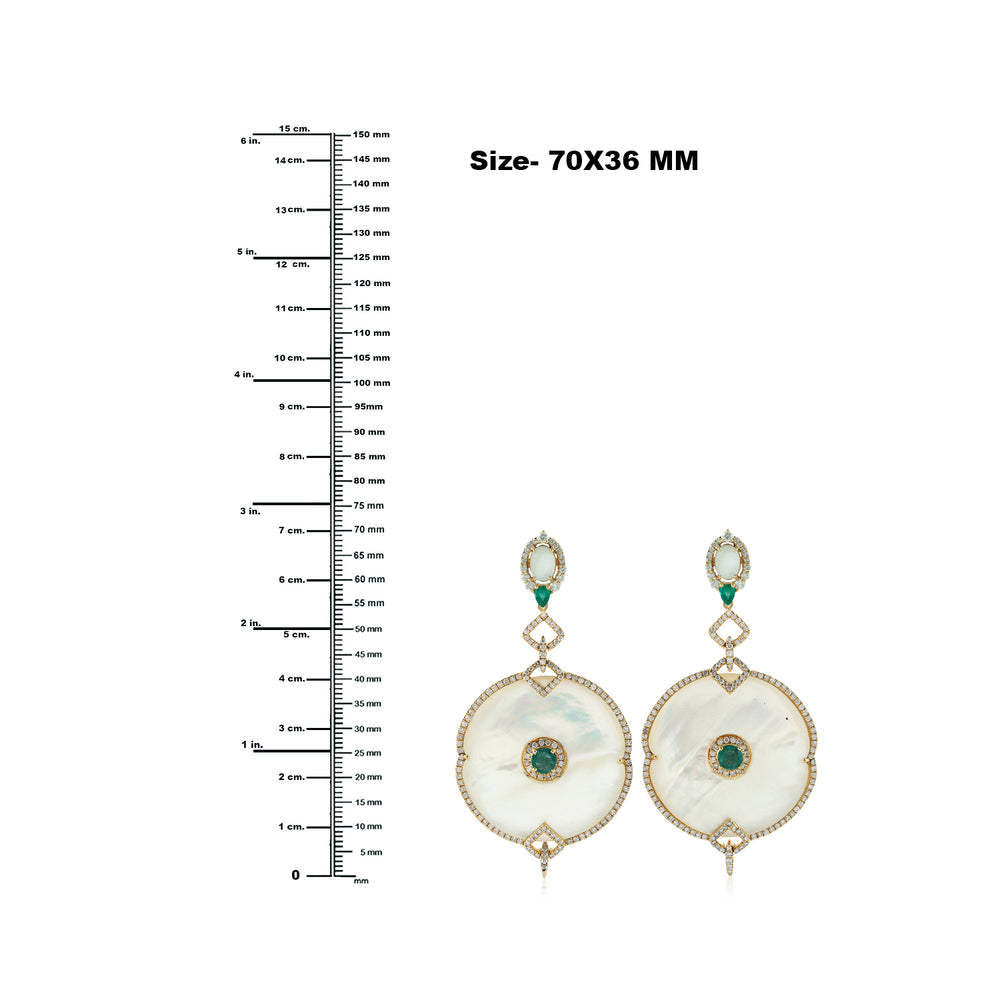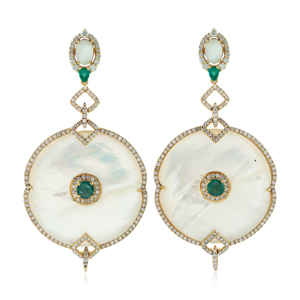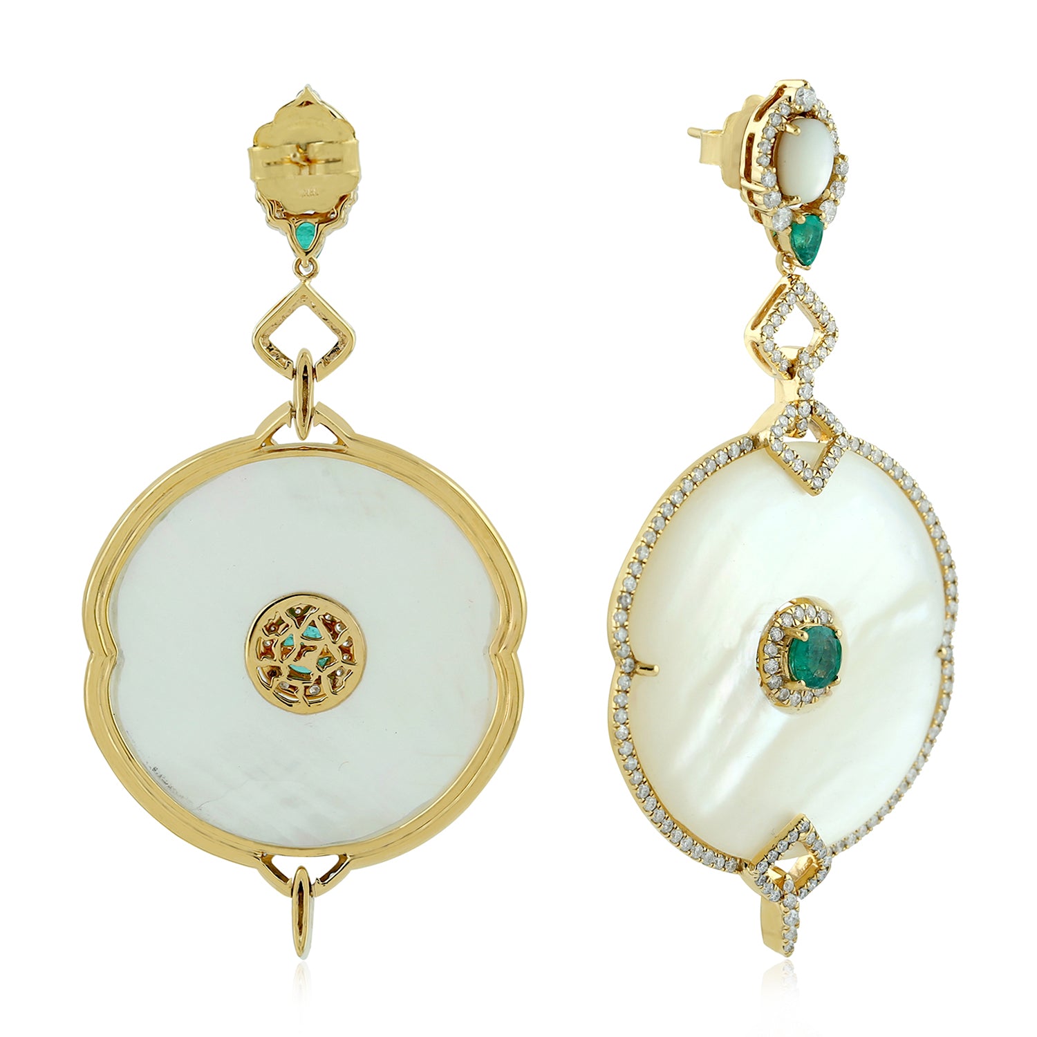 18K Yellow Gold Oval Cut Mop Gemstone Emerald Pave Diamond Luxury Dangler