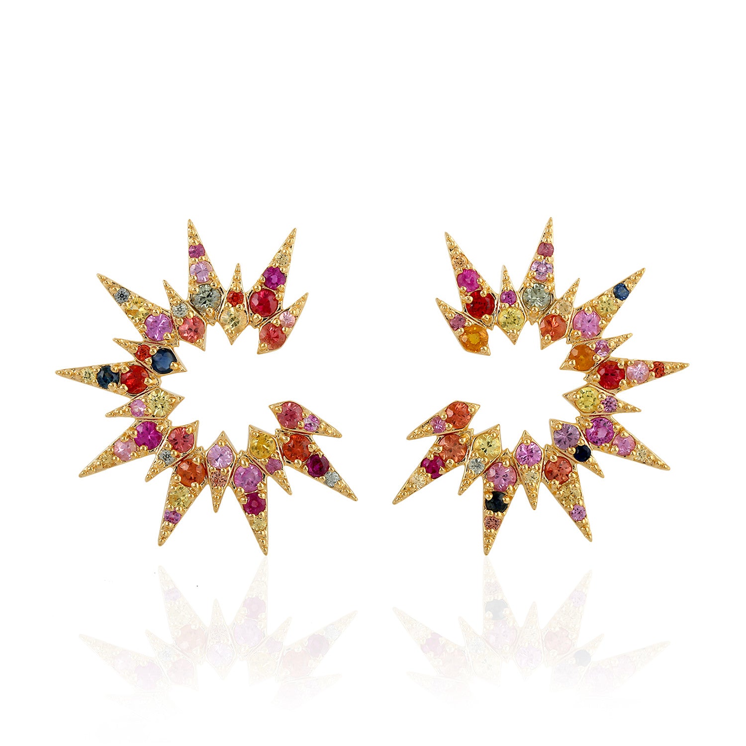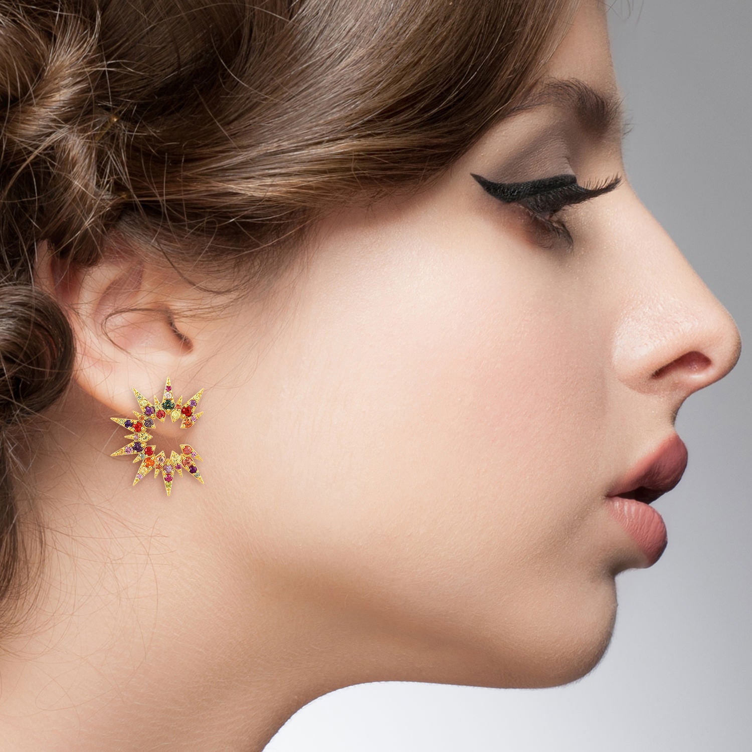 • 18K Yellow Gold Pave Multi Sapphire Gemstone Star Stud Earrings