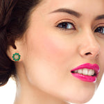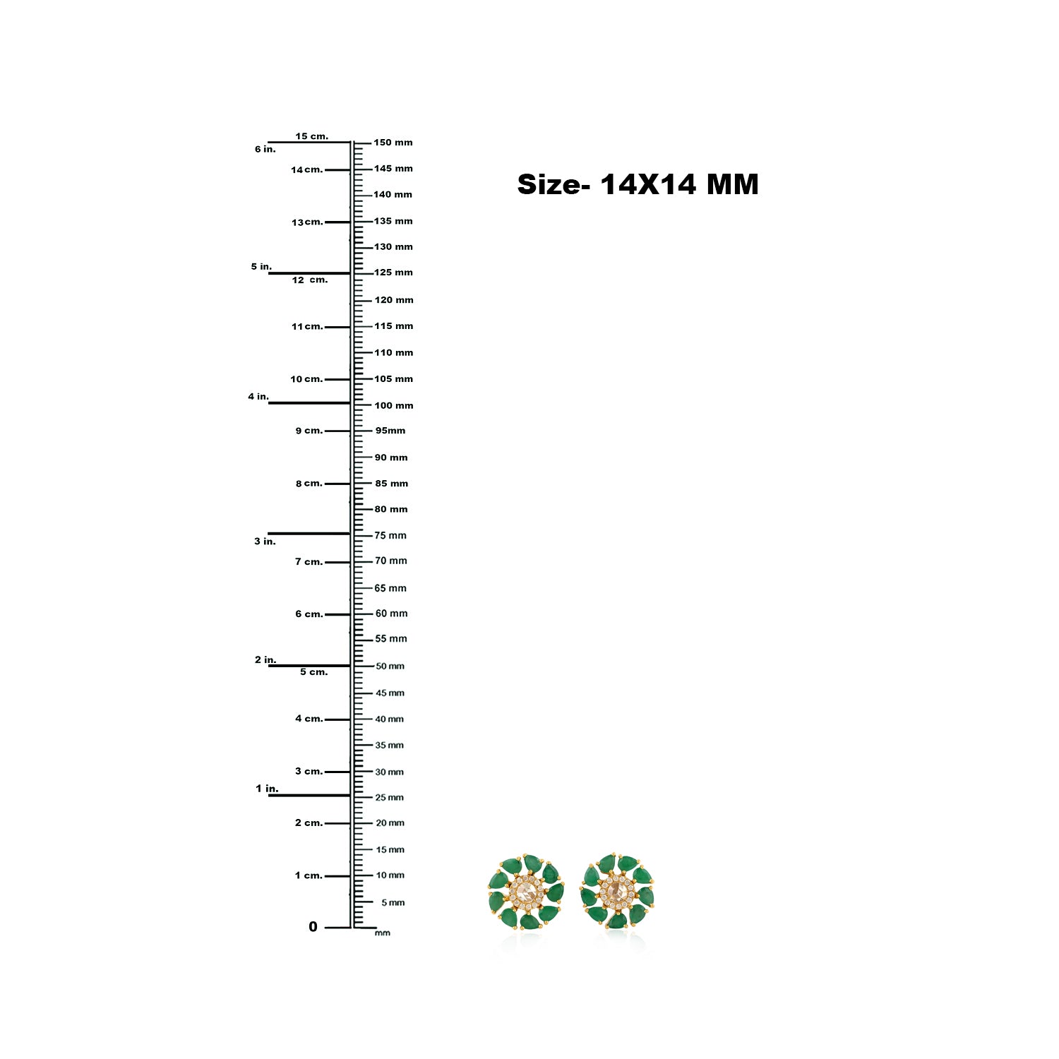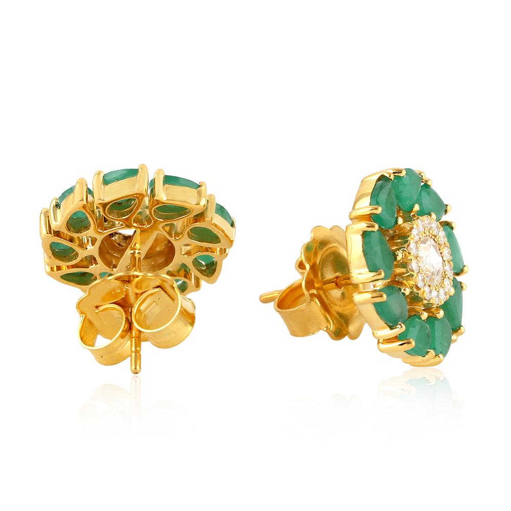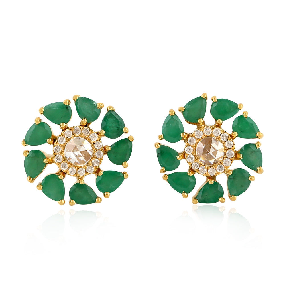 18K Yellow Gold Pear Emerald Prong Uncut Diamond Flower Stud Earrings