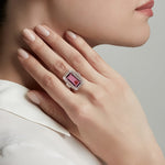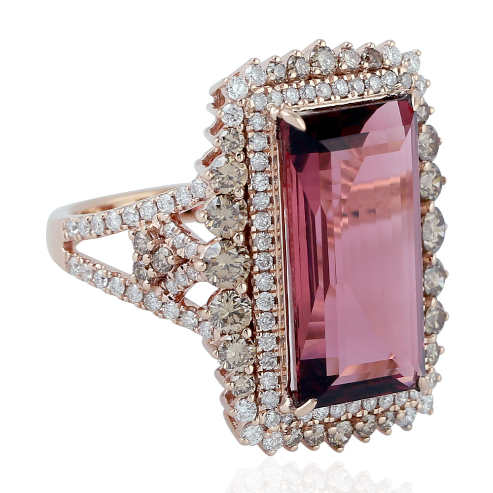Baguette Cut Pink Tourmaline Long Ring in 18K Rose Gold with Pave Diamonds – Elegant Statement Jewelry