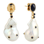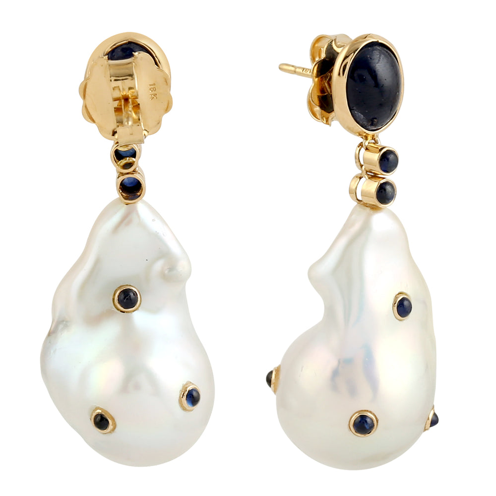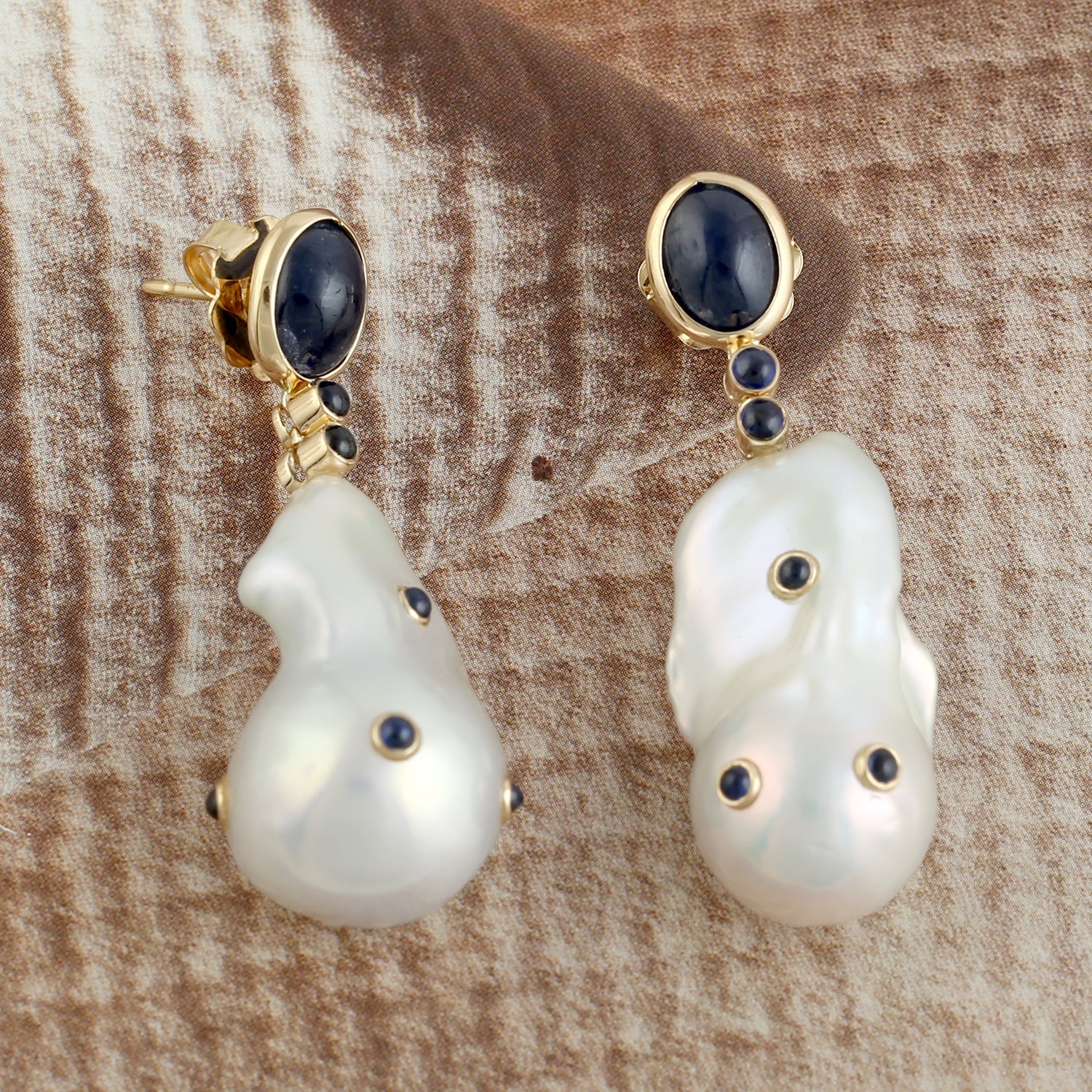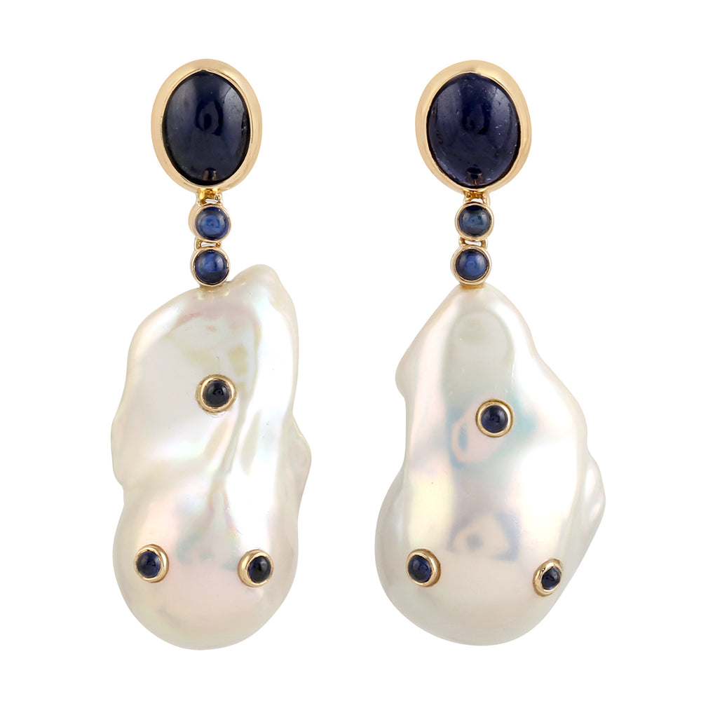 18K Yellow Gold Baroque Pearl Chinese Bezel Blue Sapphire Dangle Earrings