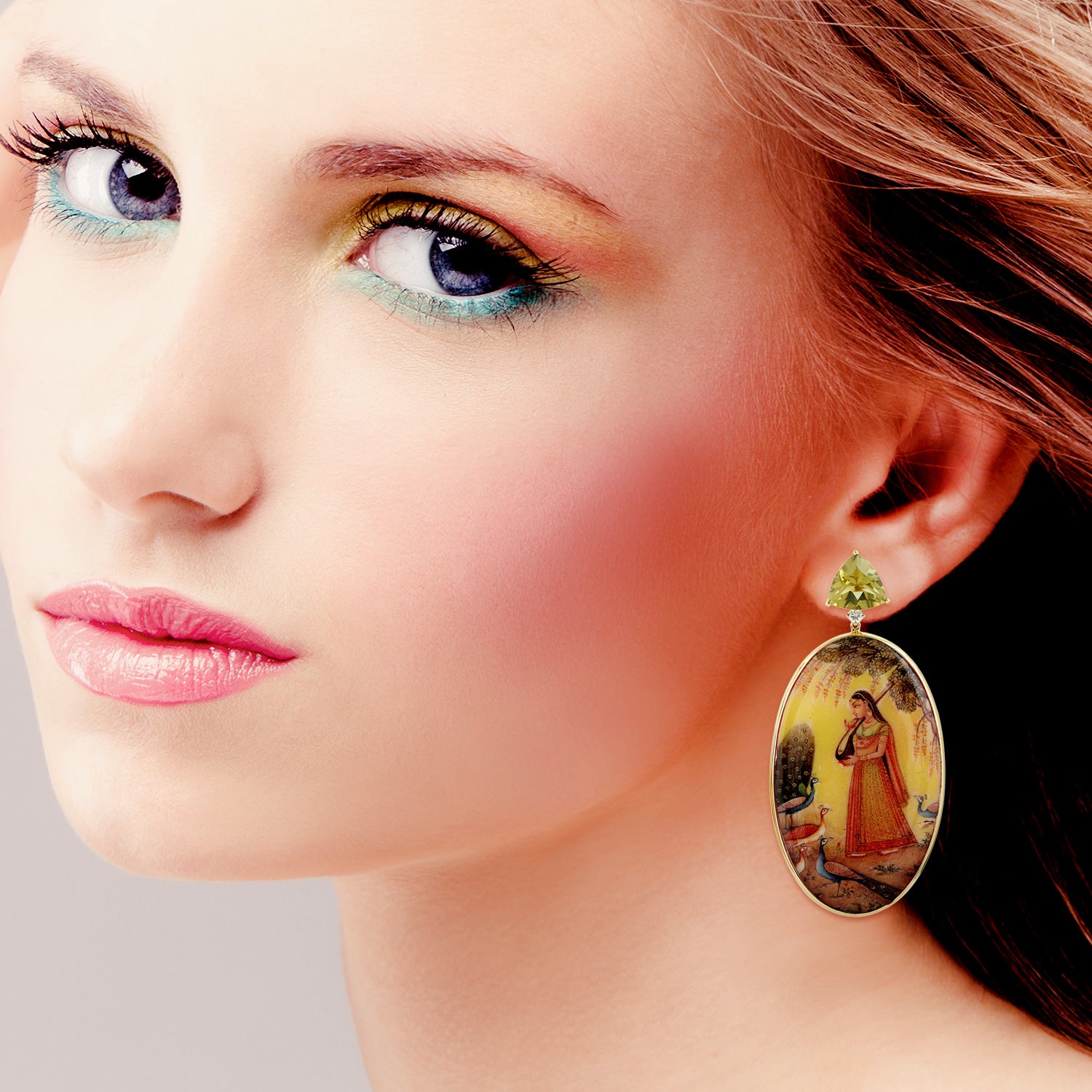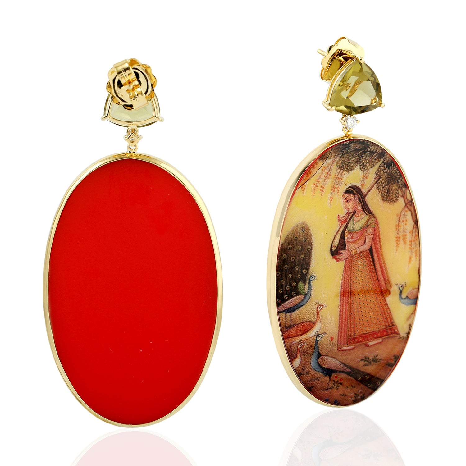 Lemon Quartz Picture Bakelite Prong Diamond Dangle Earrings In Yellow Gold