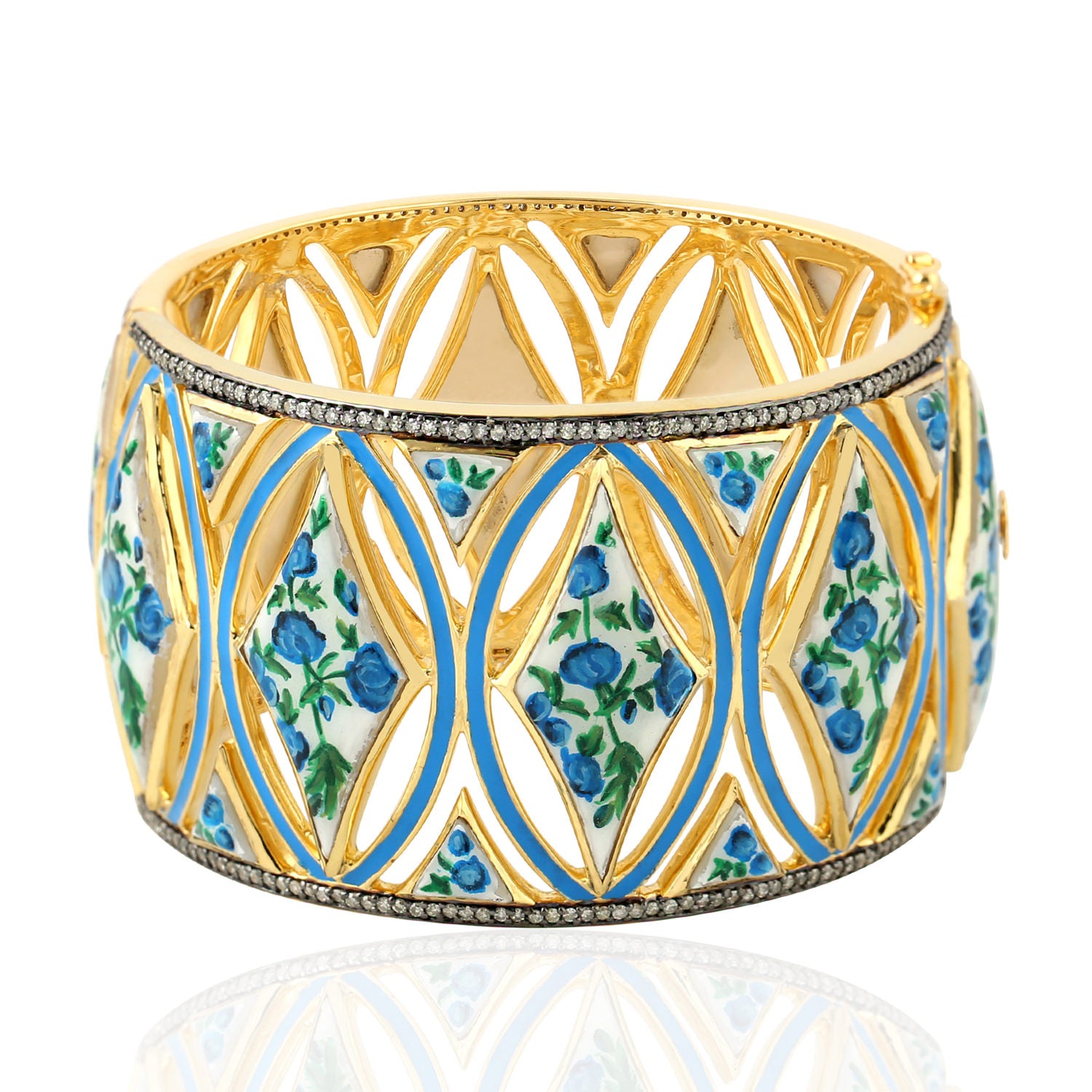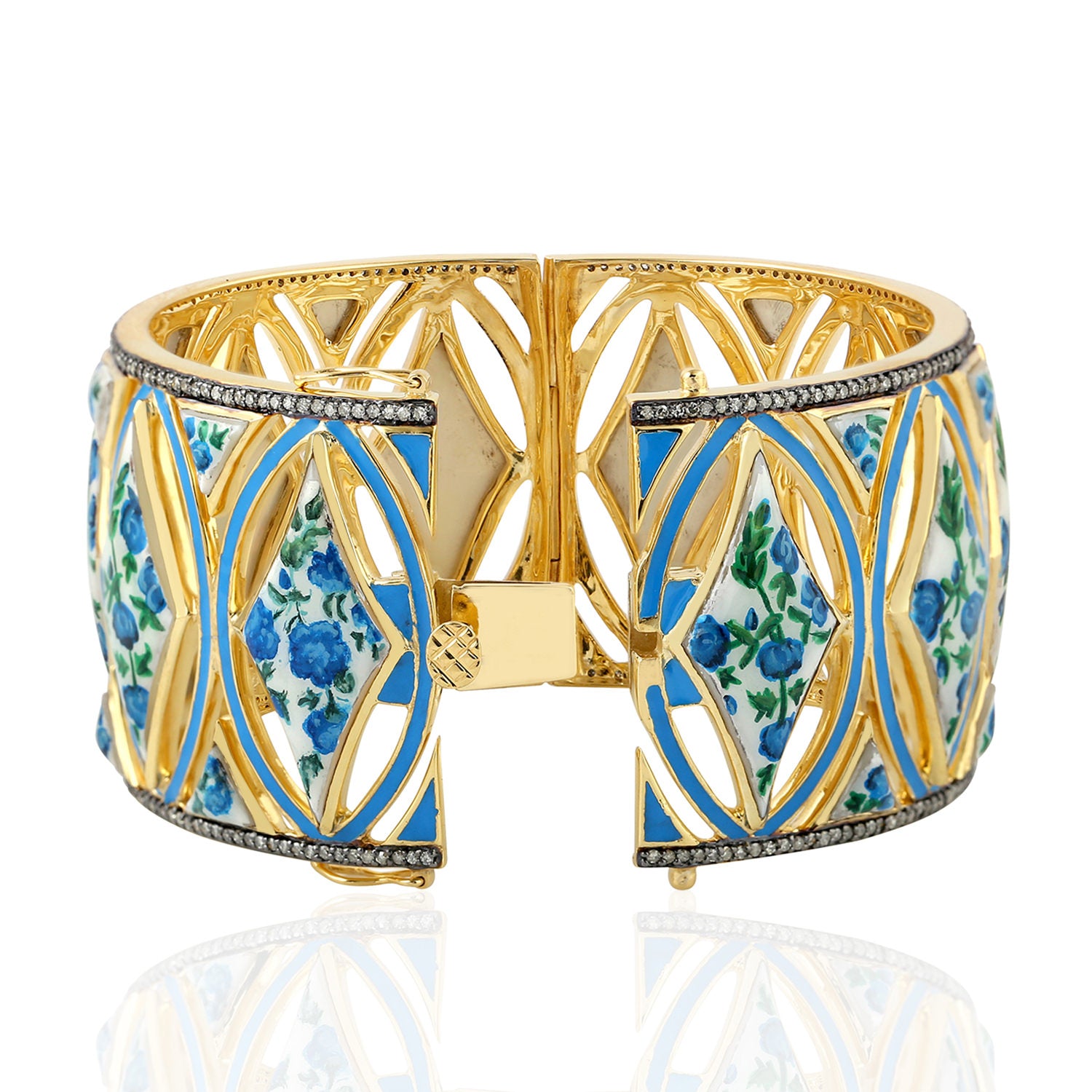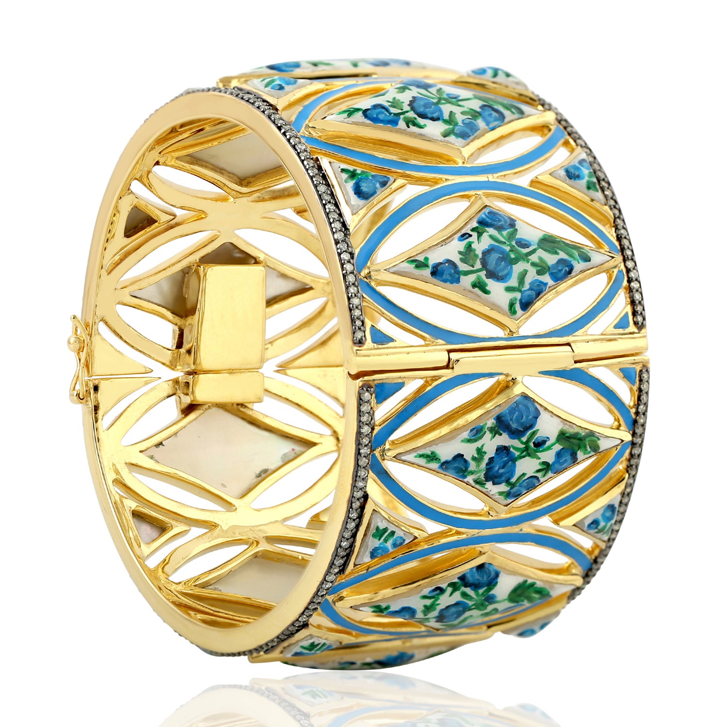 Mother of Pearl Pave Diamond Enamel Wide Bangle In Yellow Gold 925 Silver