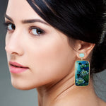 Carved MOP Bezel Blue Topaz Prong Diamond Enamel Dangler In 18k Yellow Gold