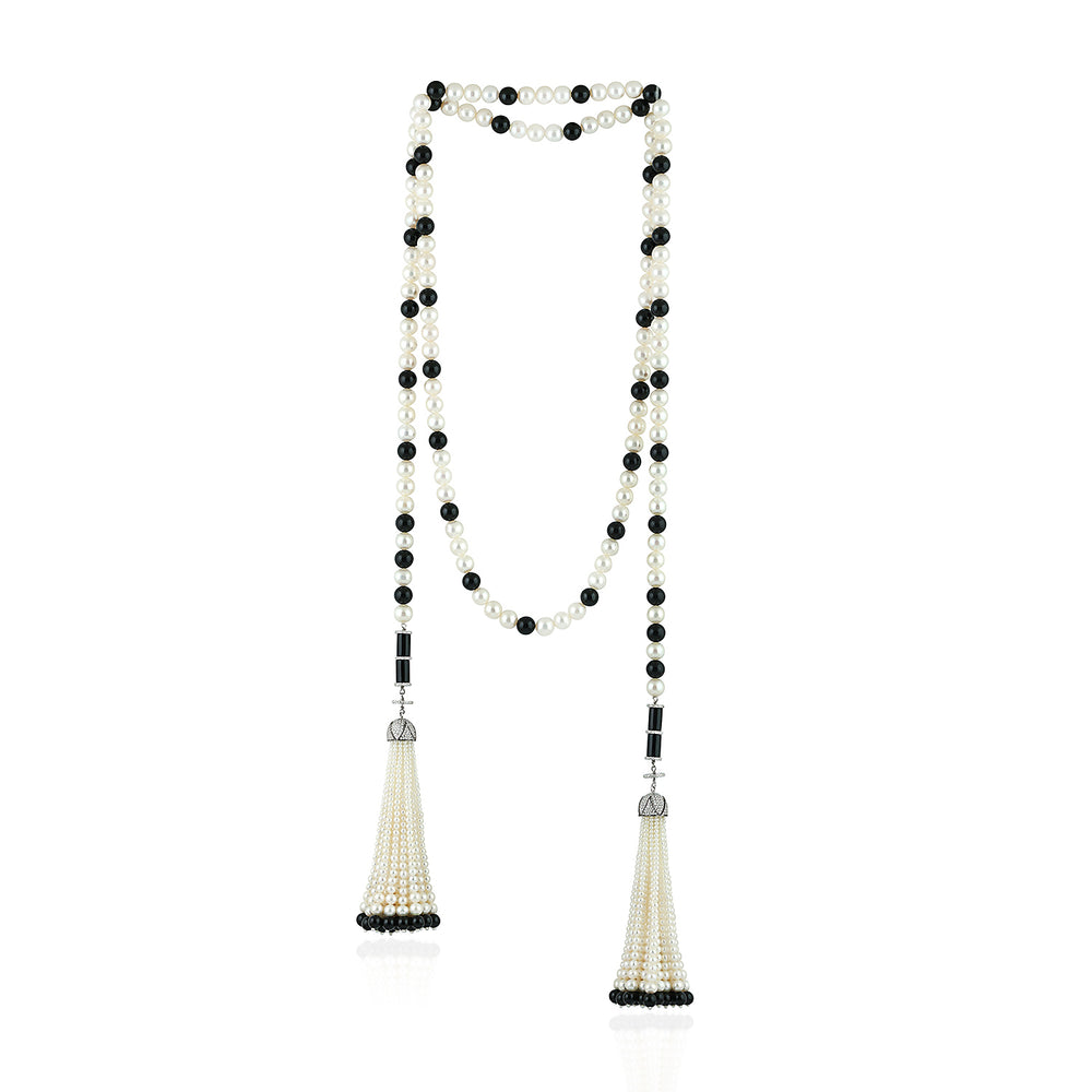 Pearl, Chinese Onyx & Pave Diamond Beads Tassel Rope Necklace in White Gold