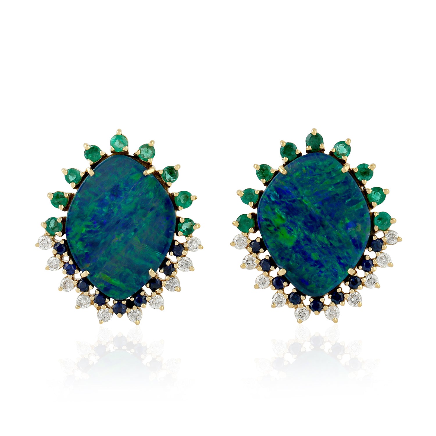 Australian Opal, Emerald & Sapphire Pave Diamond Halo Stud Earrings in 18K Yellow Gold