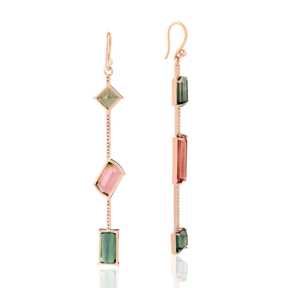 Multi-Tourmaline Gemstone & Pave Diamond Hook Earrings in Rose Gold