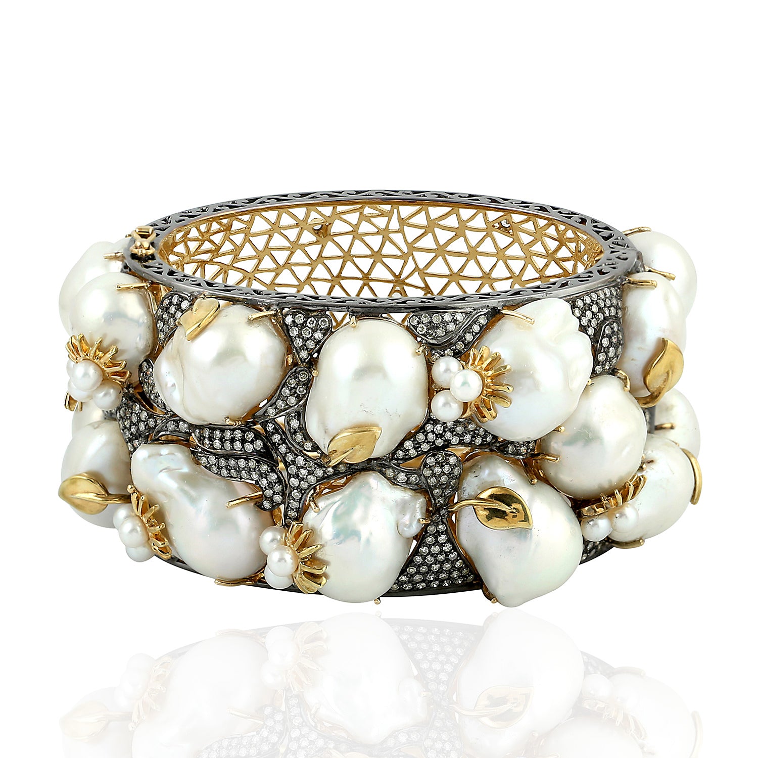 Baroque Pearl Pave Diamond & Sapphire Bangle In Gold 925 Sterling Silver