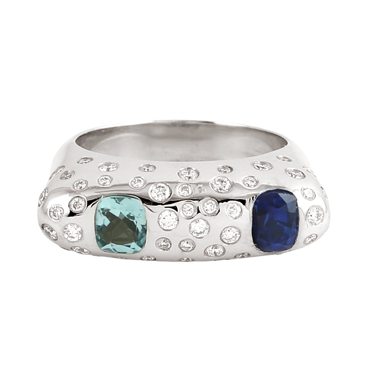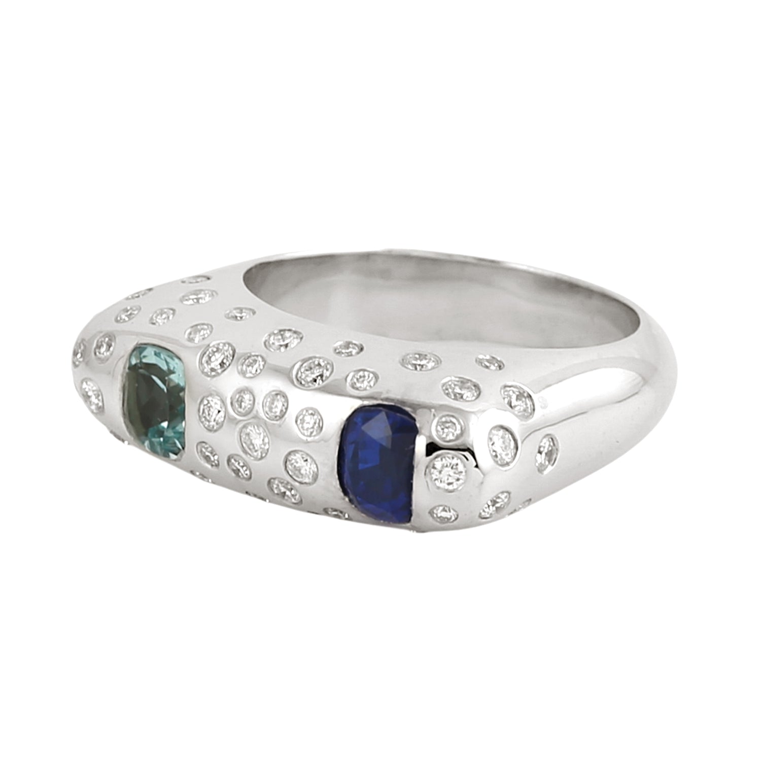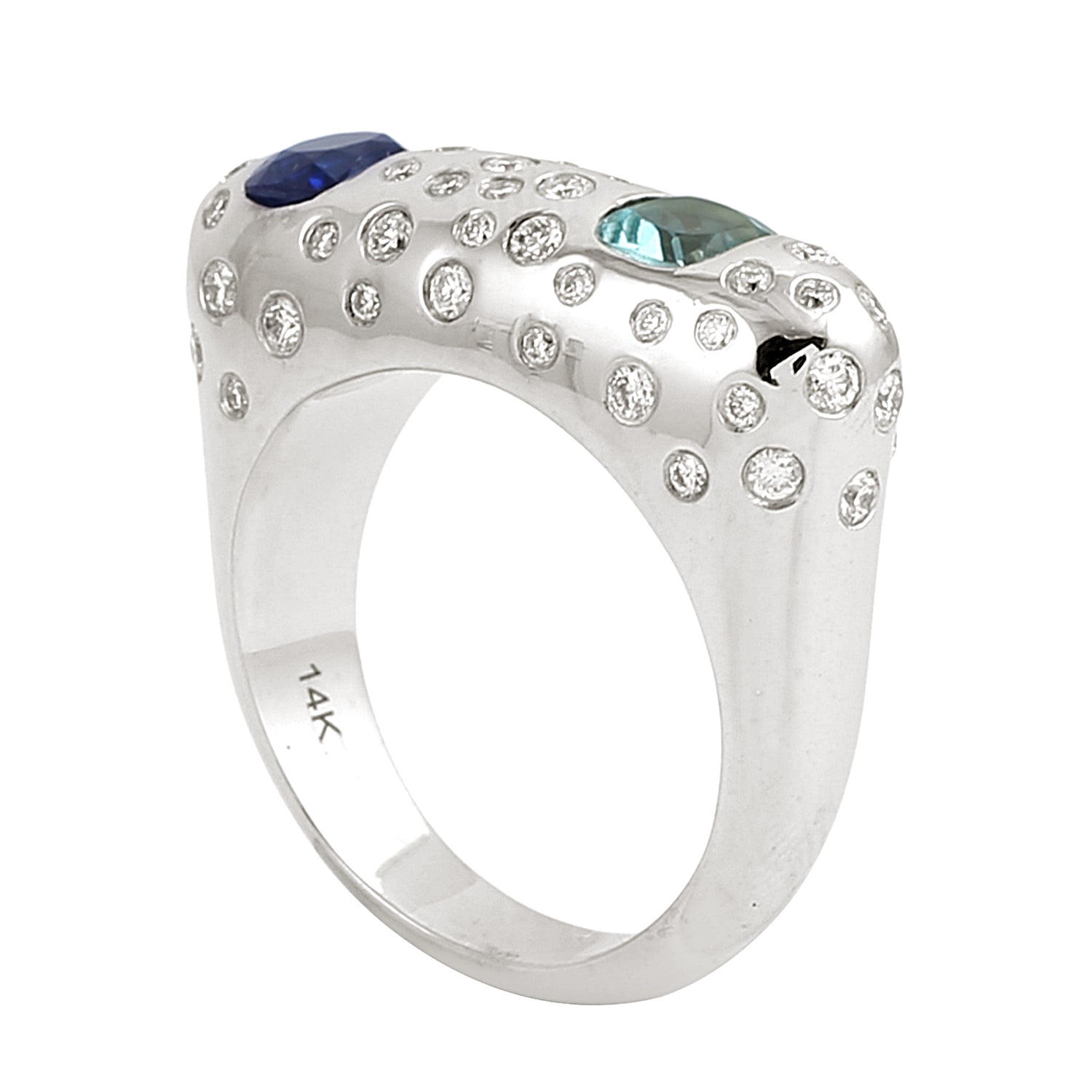 Blue Sapphire & Aquamarine Bezel Diamond Designer Ring in 14K White Gold