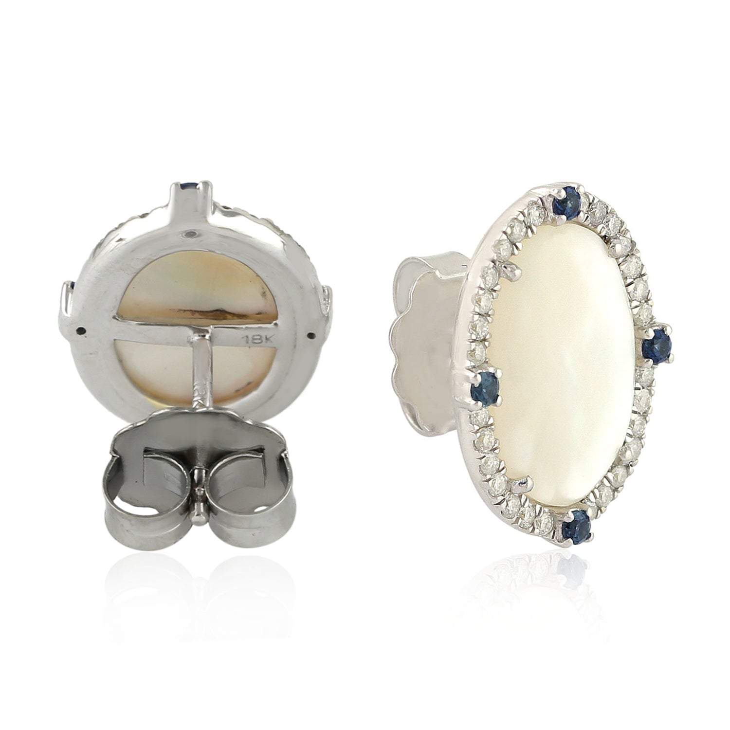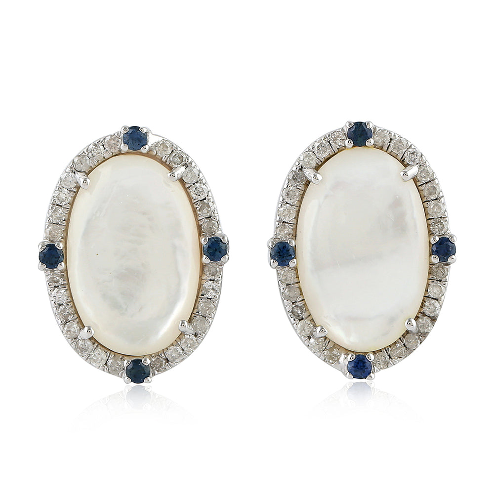 Oval Pearl, Blue Sapphire & Pave Diamond Stud Earrings in White Gold