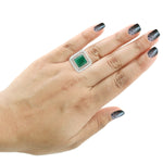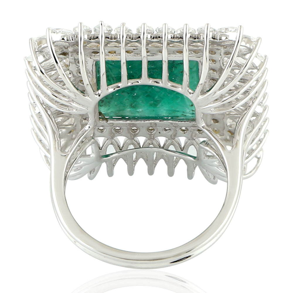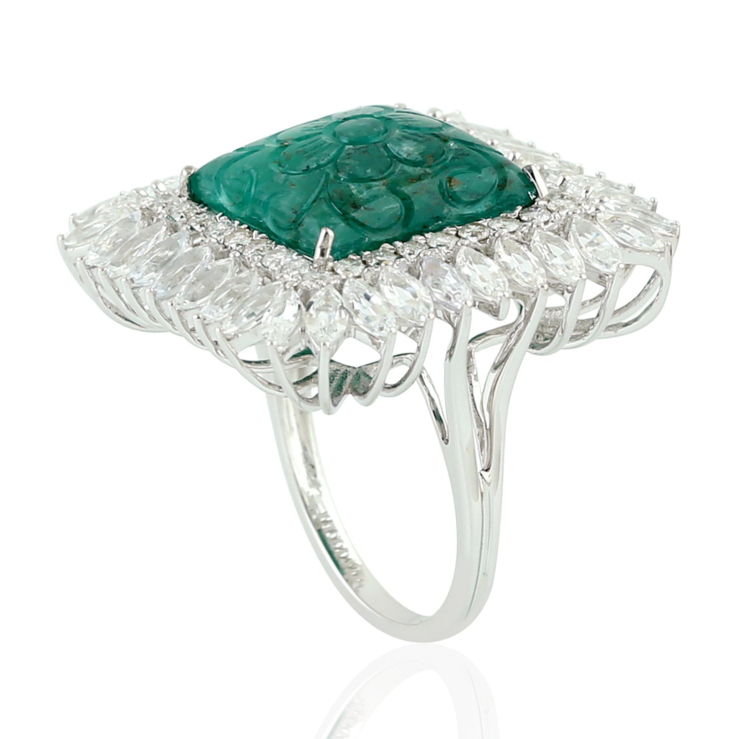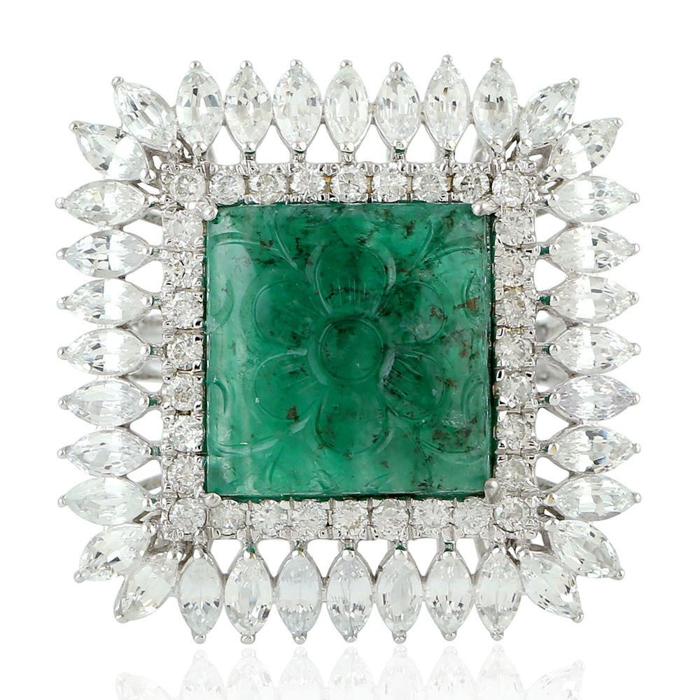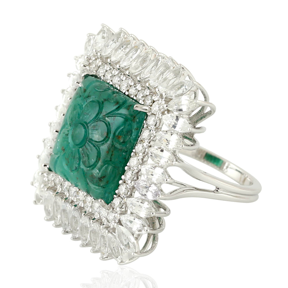 Carved Emerald White Sapphire Pave Diamond Cocktail Ring In 18K White Gold