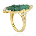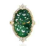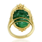 Carved Green Jade Pave Rose Cut Diamond Cocktail Ring In 18K Yellow Gold