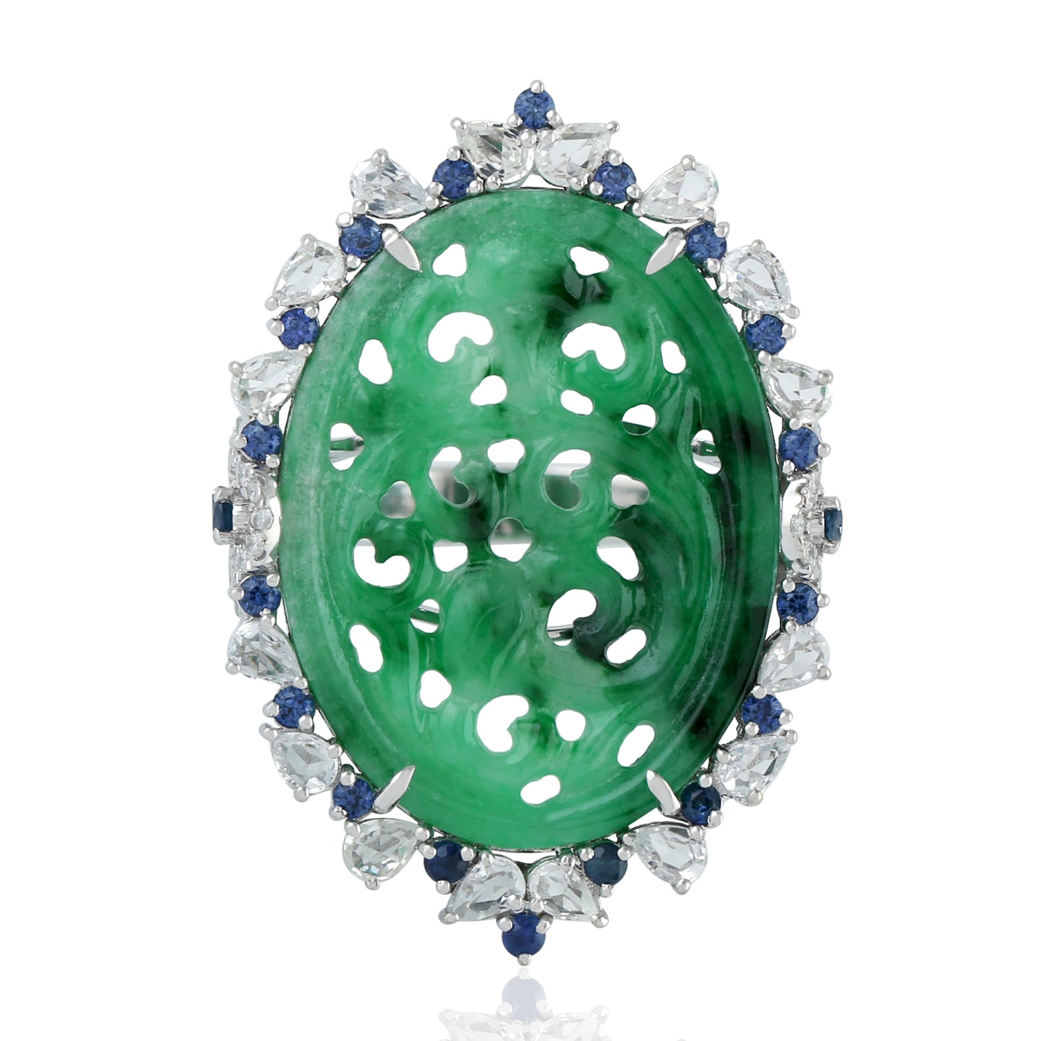 Carved Jade Pave Rose Cut Diamond Prong Blue Sapphire Cocktail Ring In White Gold
