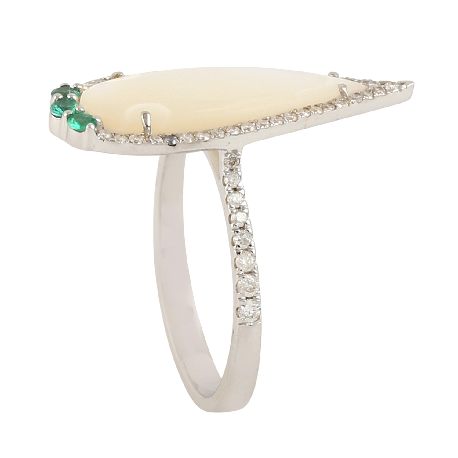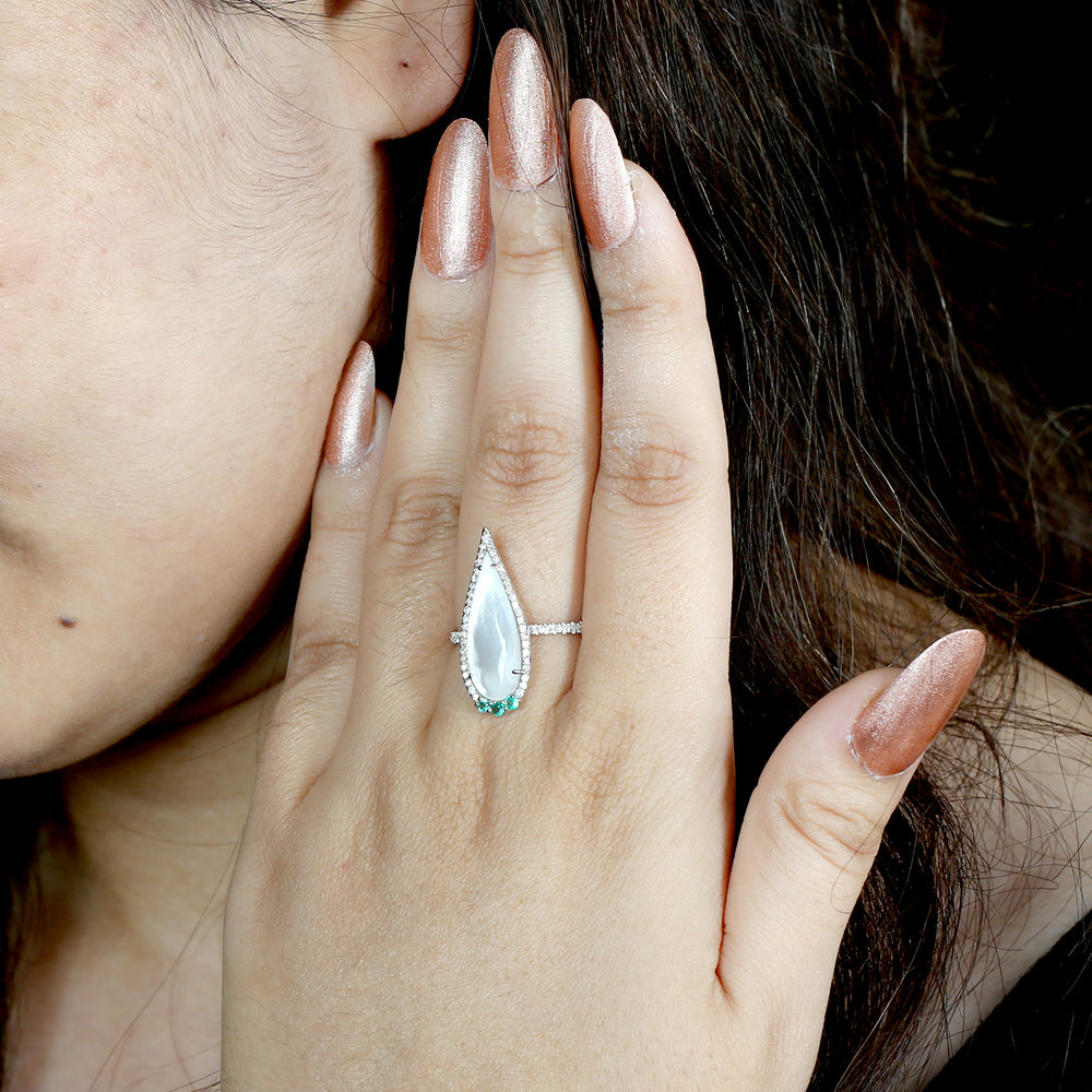 Mother Of Pearl Prong Emerald Pave Diamond In White Gold Long Ring