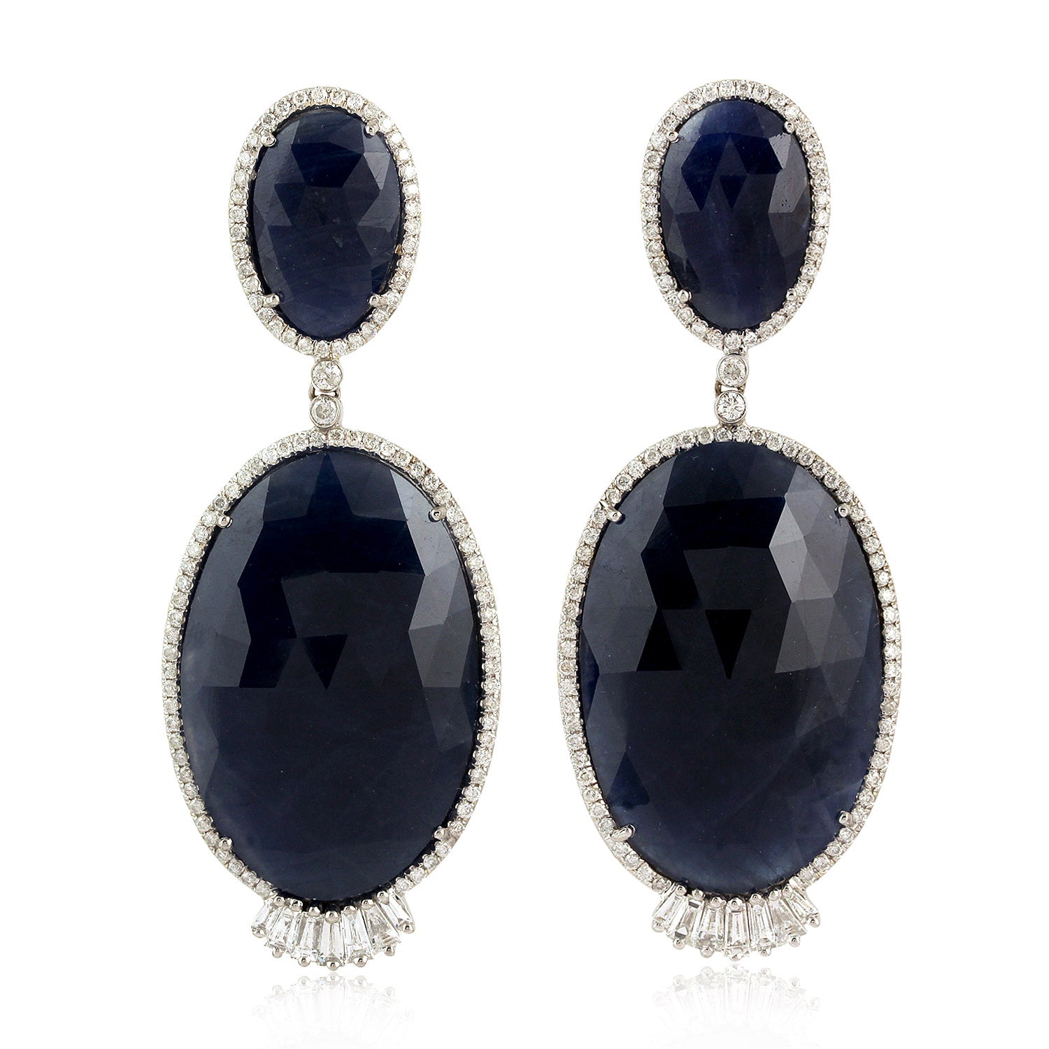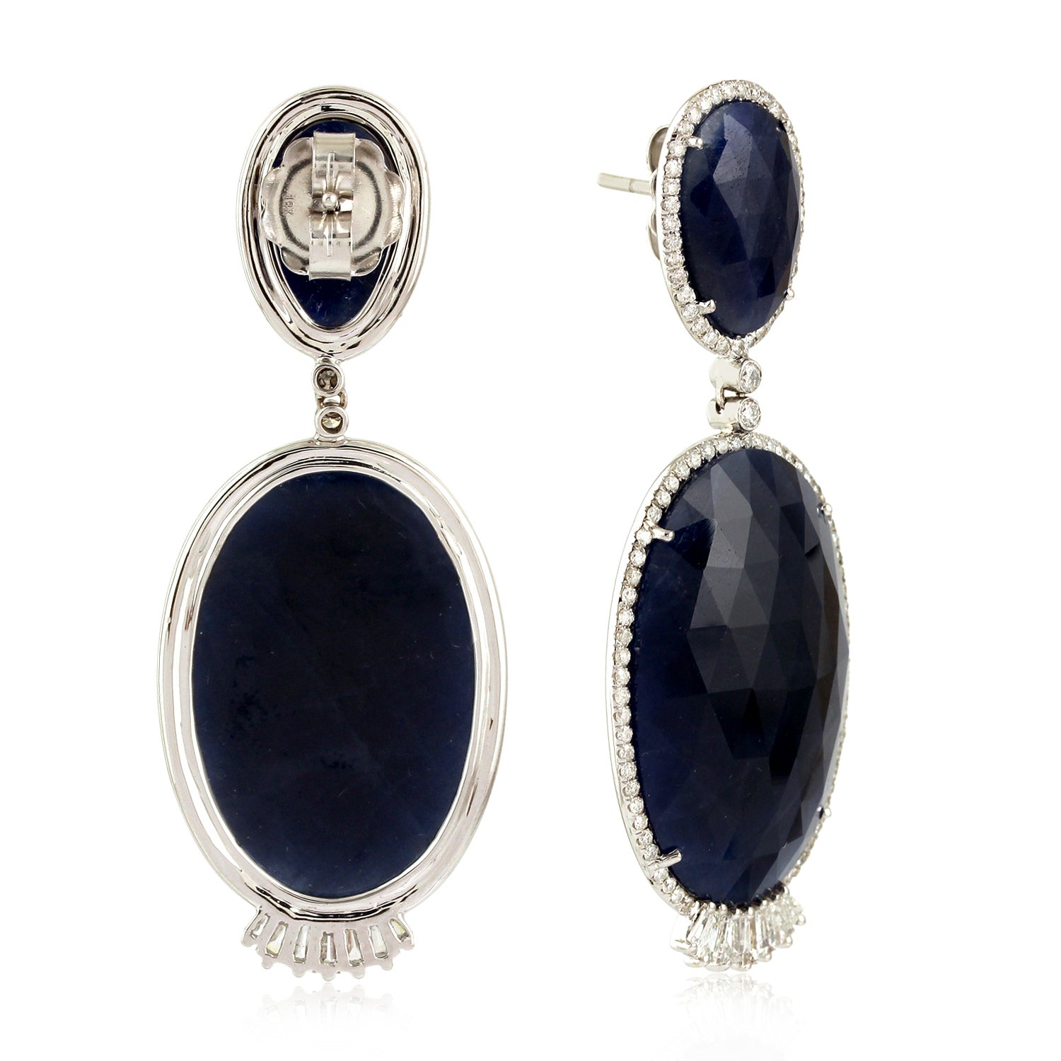 Egg-Cut Blue Sapphire & Baguette Diamond Dangle Earrings in 18K White Gold