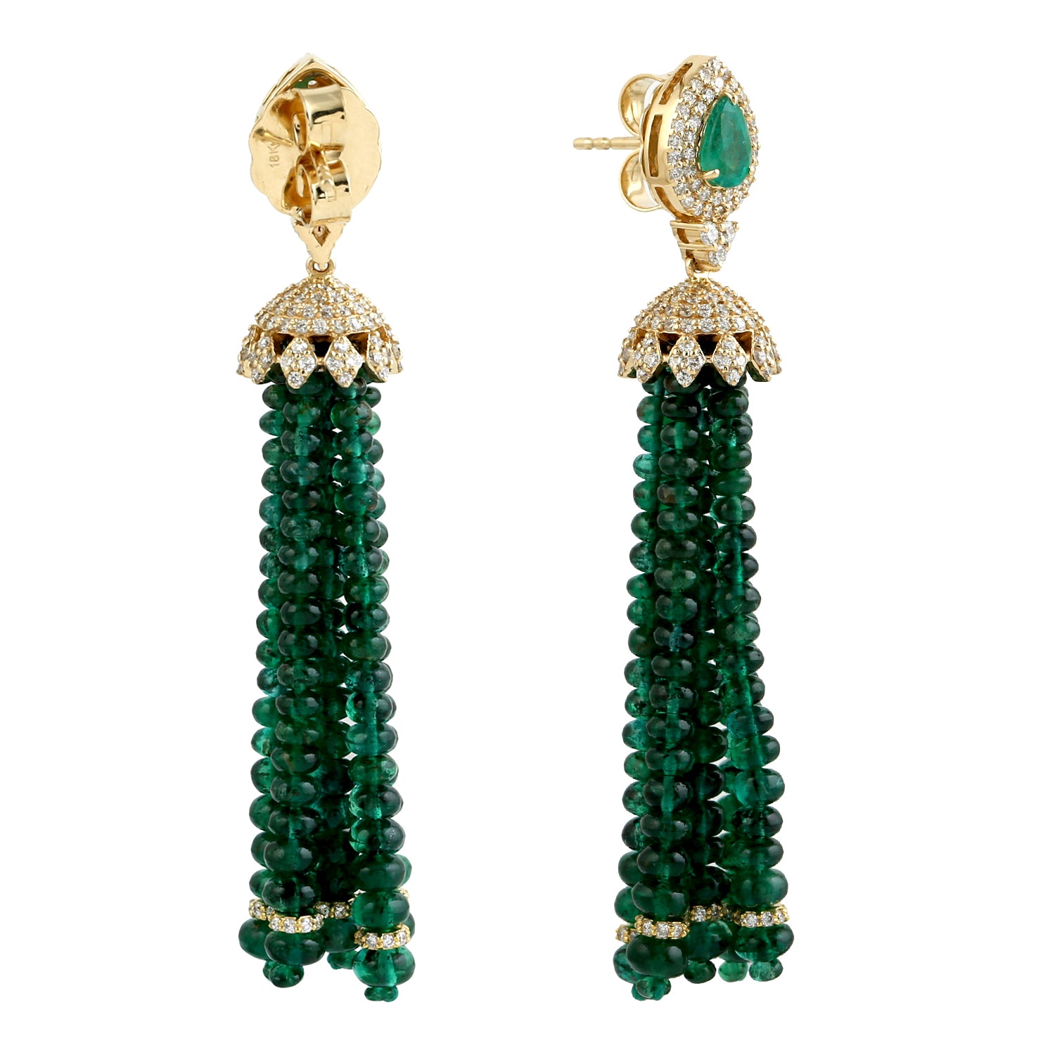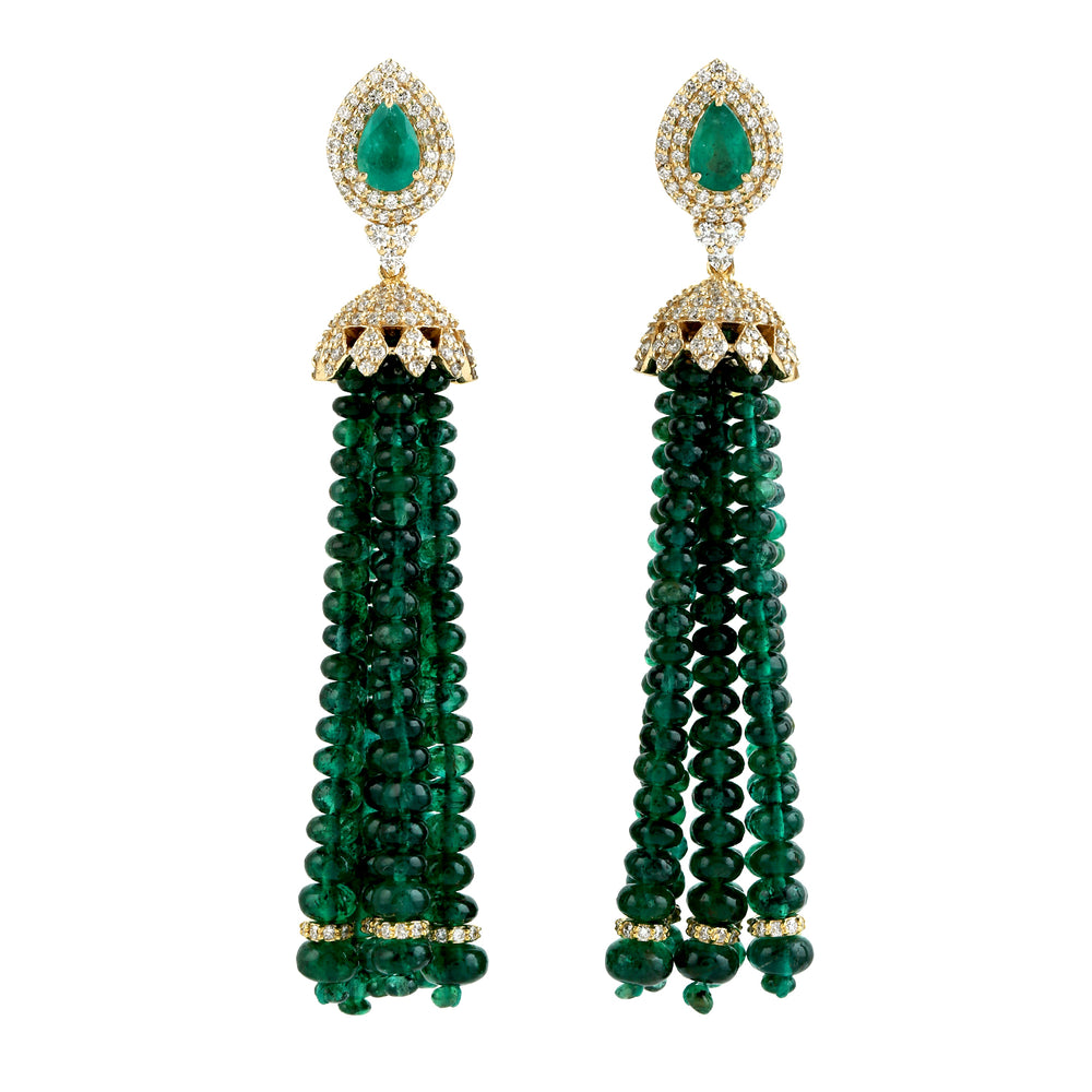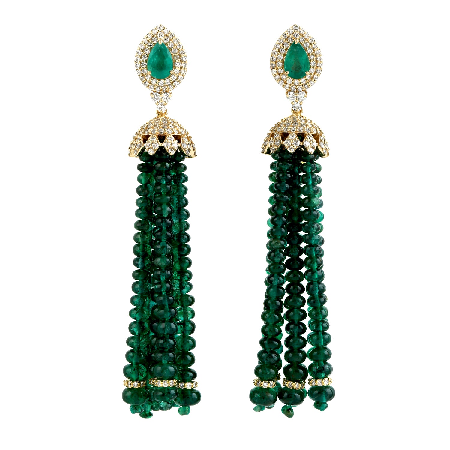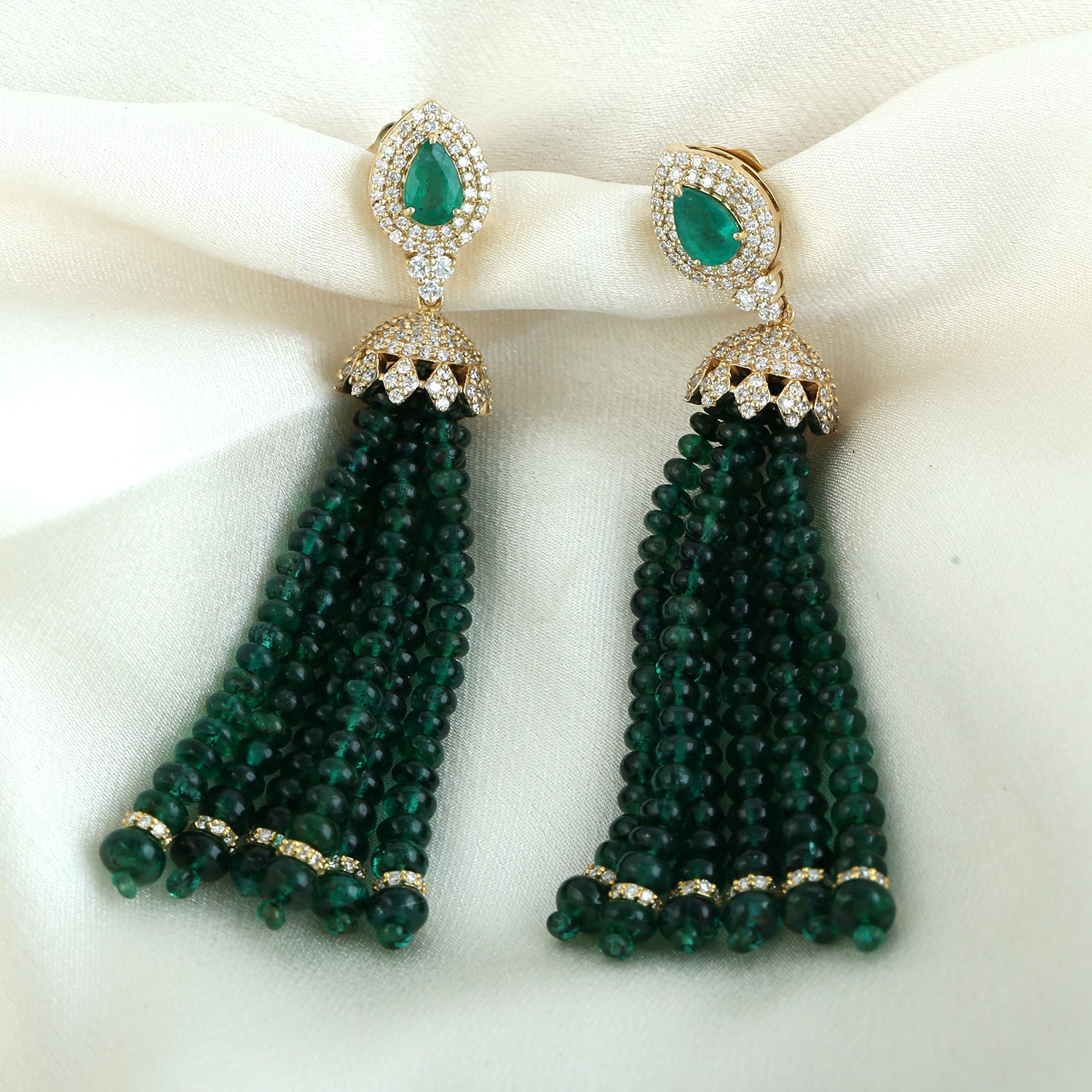 Emerald Gemstone Beads Pave Diamond In Gold Tassel Earrings For Women