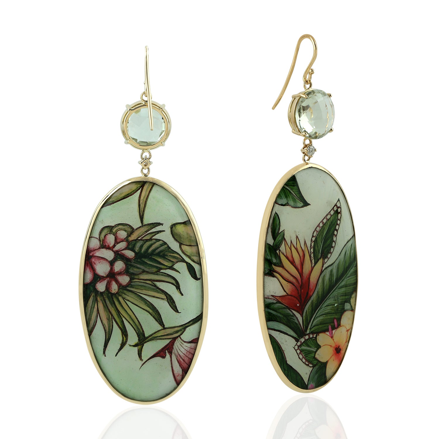 Green Amethyst Oval Cut MOP Prong Diamond Enamel Ear Hook Earrings In Gold