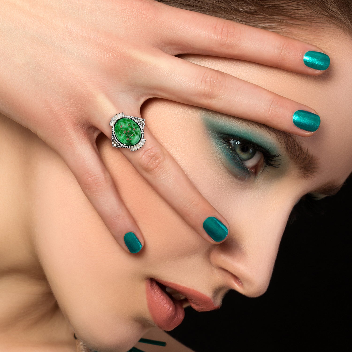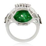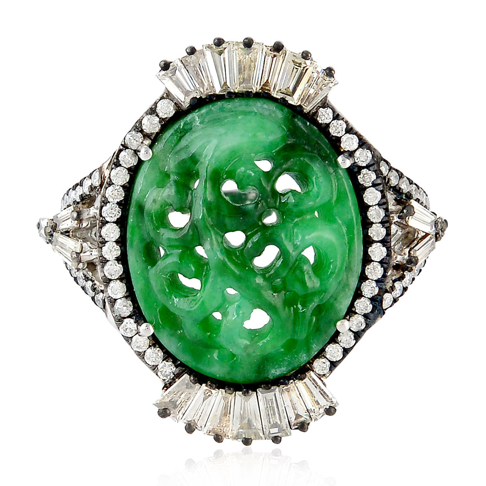 Carved Jade Gemstone Baguette Cut Diamond Cocktail Ring in 18k White Gold