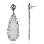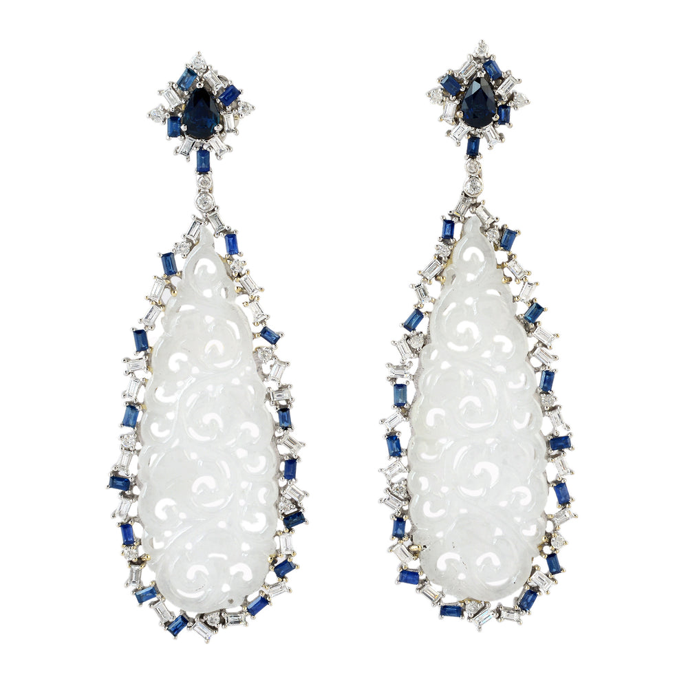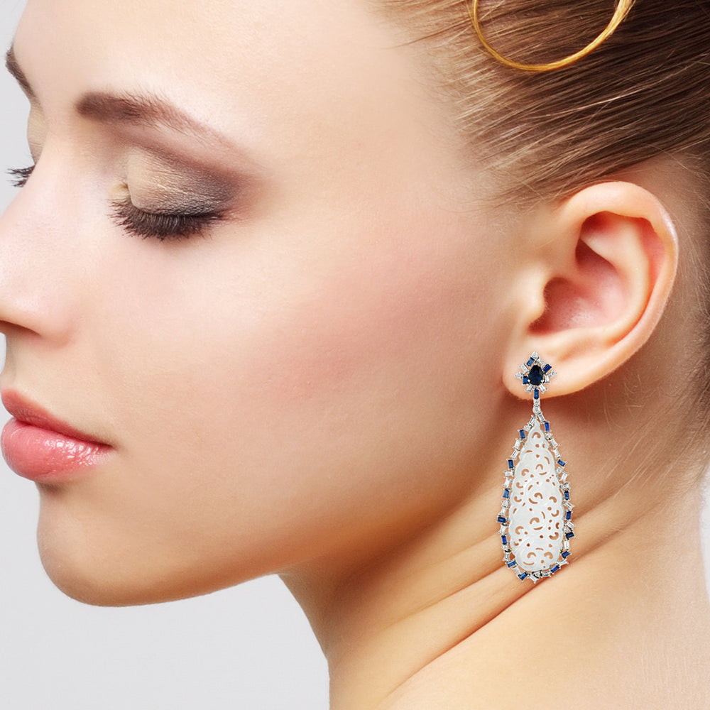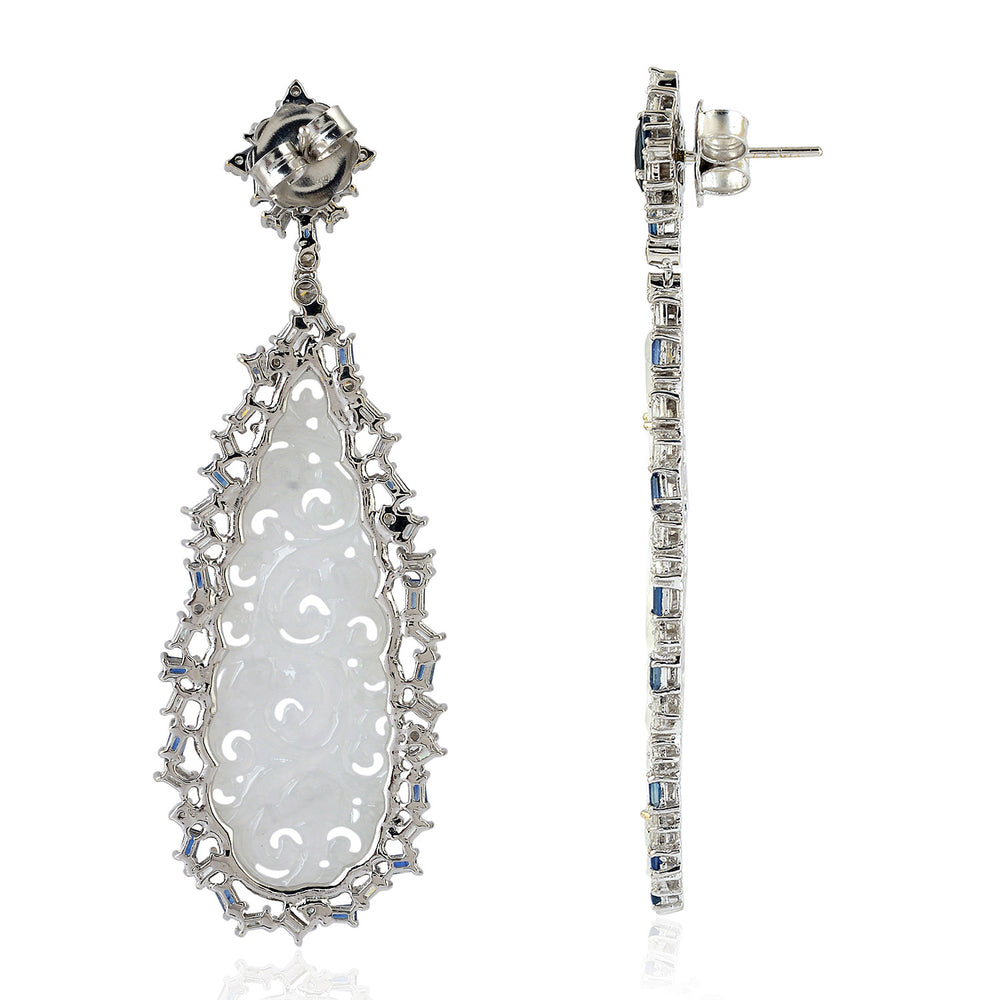 Carved Jade Baguette Blue Sapphire Gemstone Diamond Danglers In White Gold