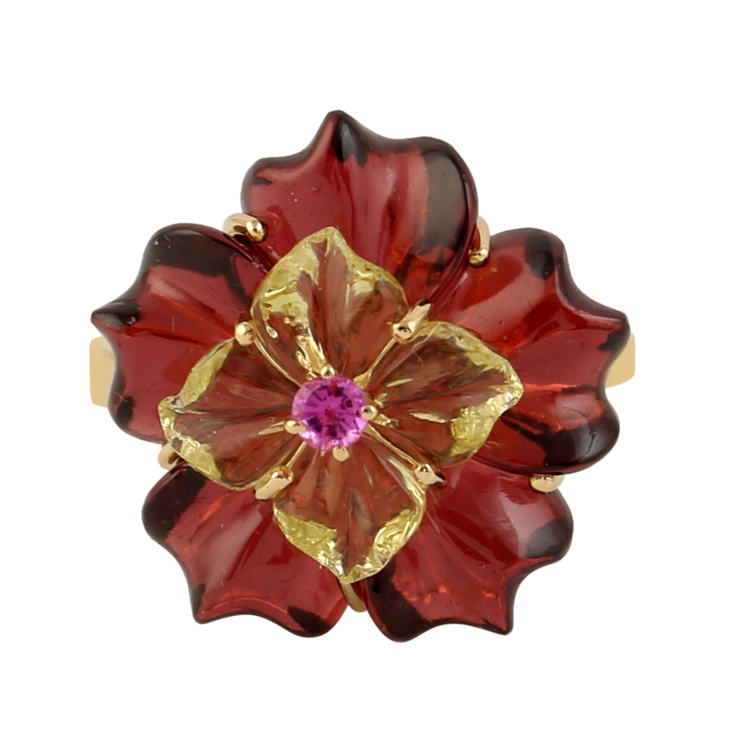 18k Yellow Gold Flower Ring Prong Ruby Carved Mix Stone Gemstone