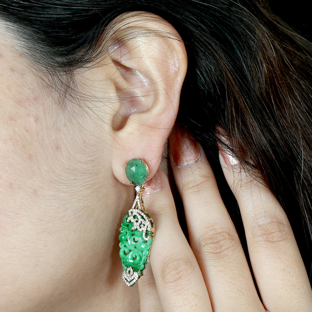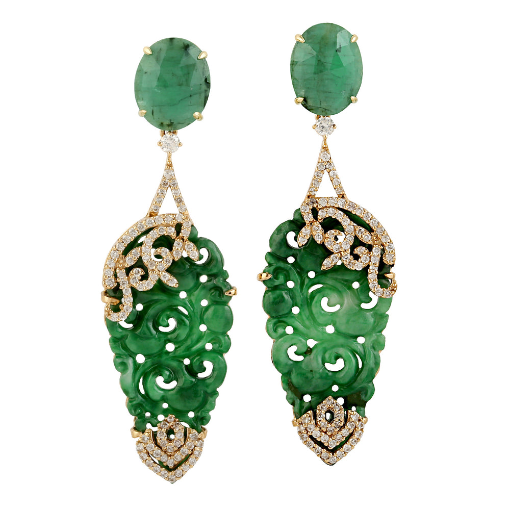 Carving Jade Oval Cut Emerald Gemstone Pave Diamond Dangles In 18k Yellow Gold