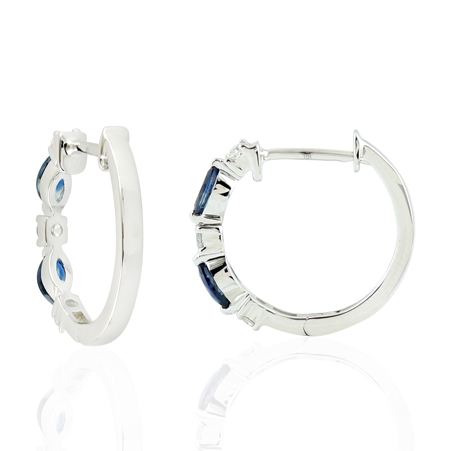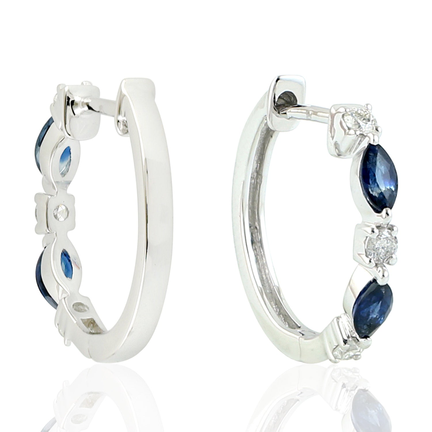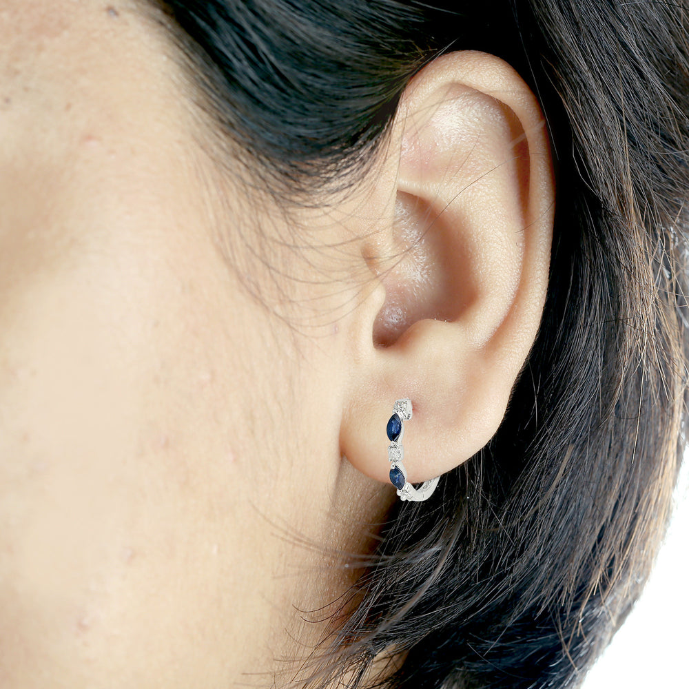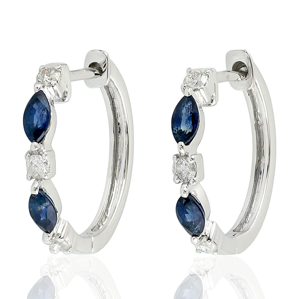 Marquise Cut Blue Sapphire Prong Diamond Hoop Earrings In 18K White Gold