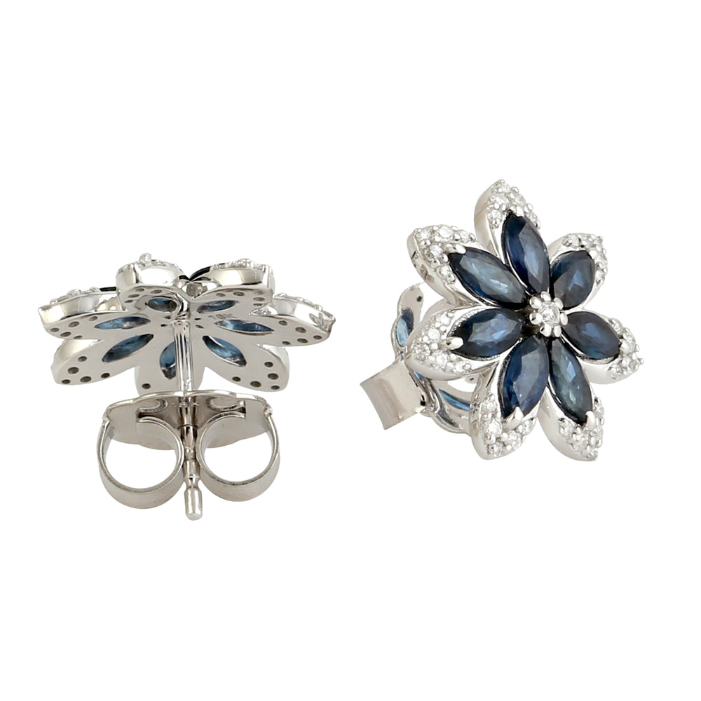Marquise Blue Sapphire Pave Diamond Daisy Stud Earrings In 18k White Gold