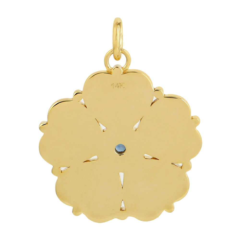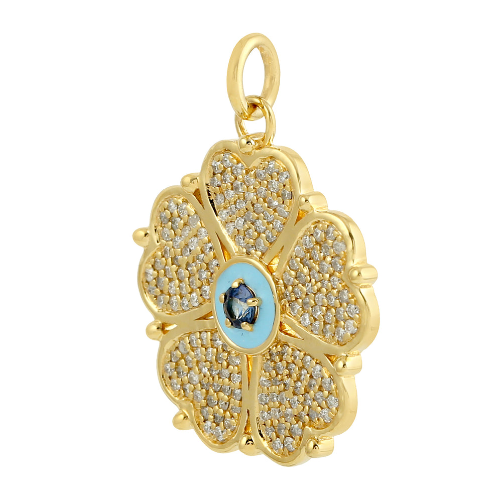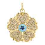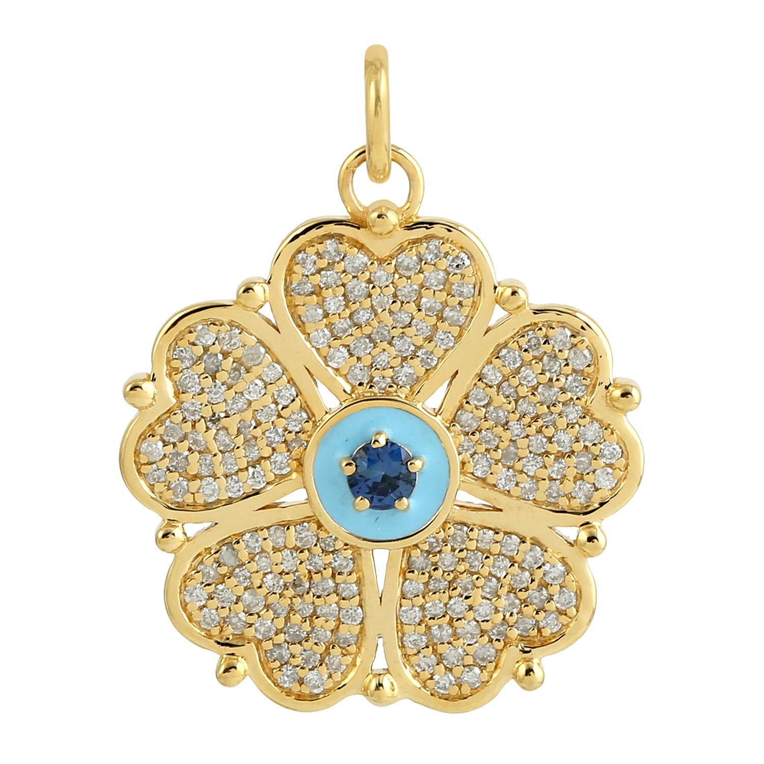 Blue Sapphire Micro Pave Diamond Heart Evil Eye Design Enamel Pendant In Yellow Gold