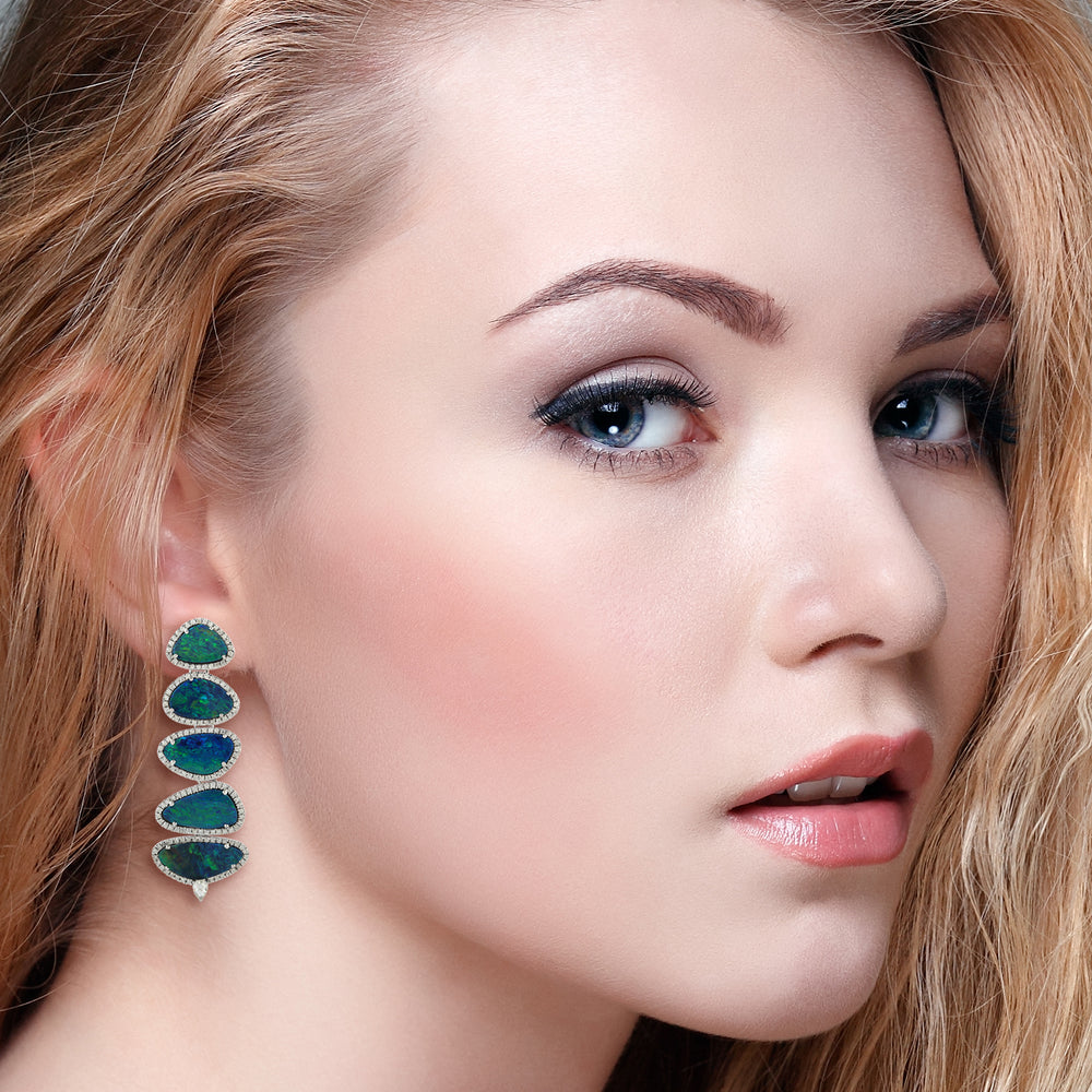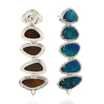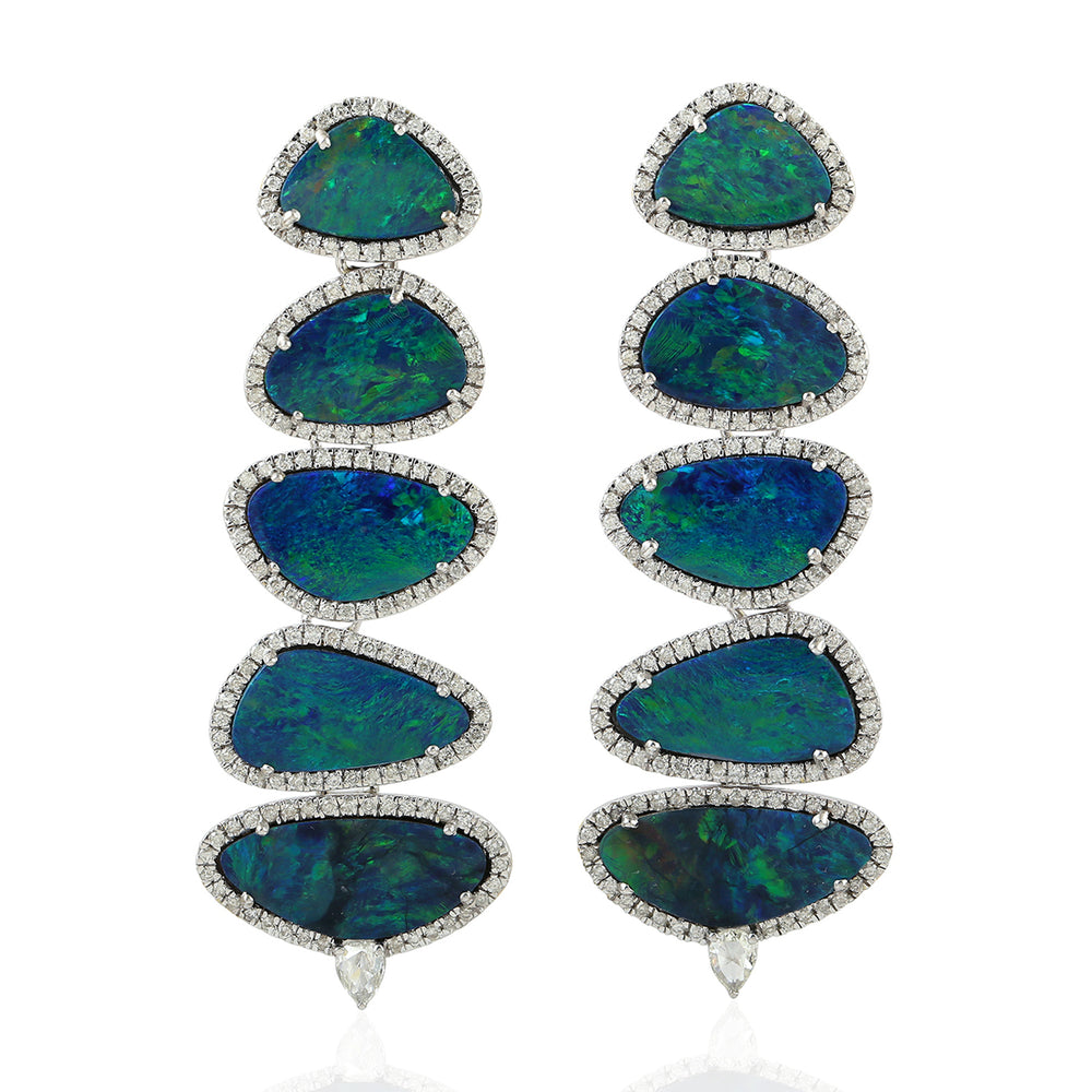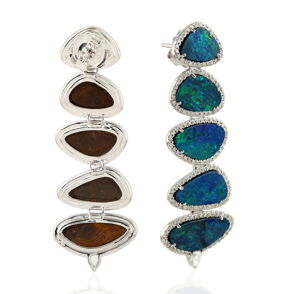 Mix Cut Opal Doublet October Prong Diamond Long Dangler 18K White Gold